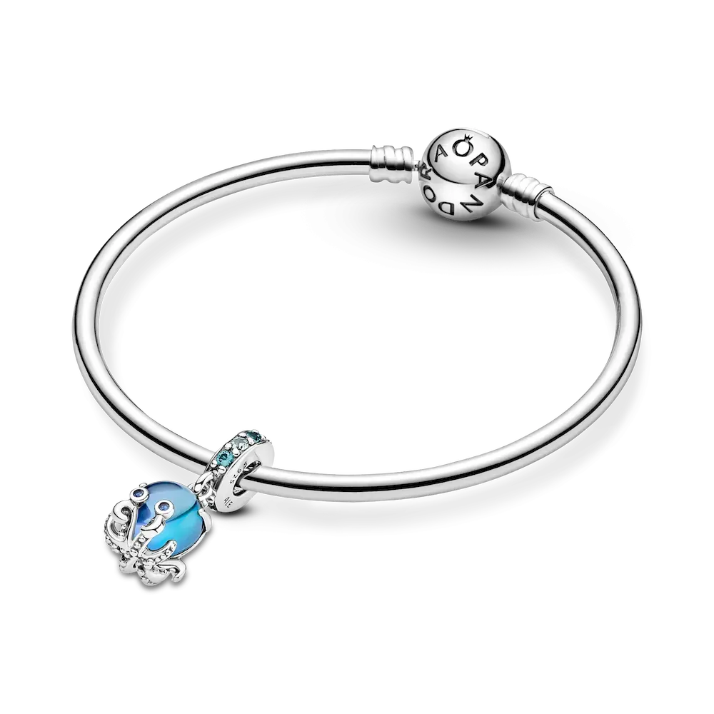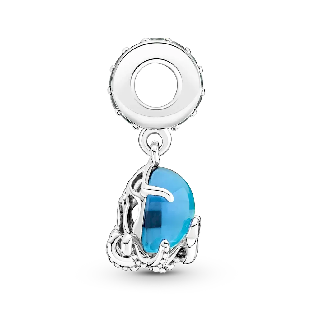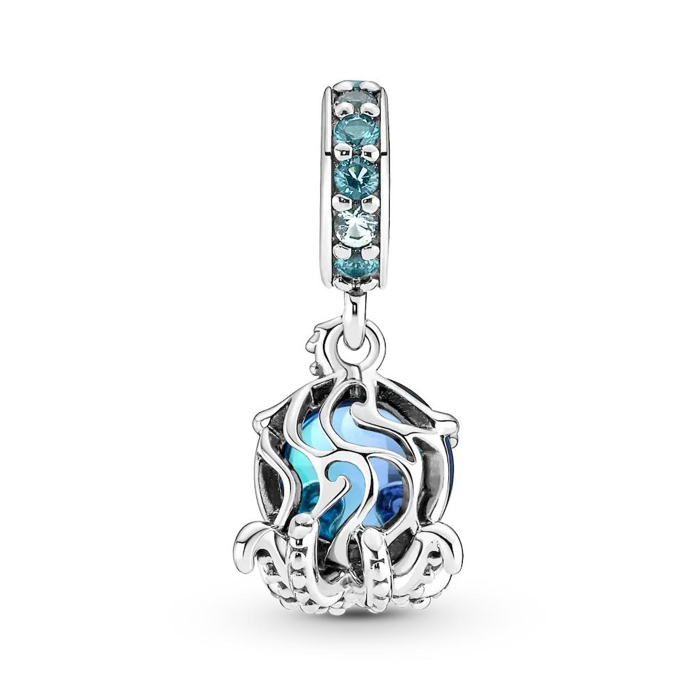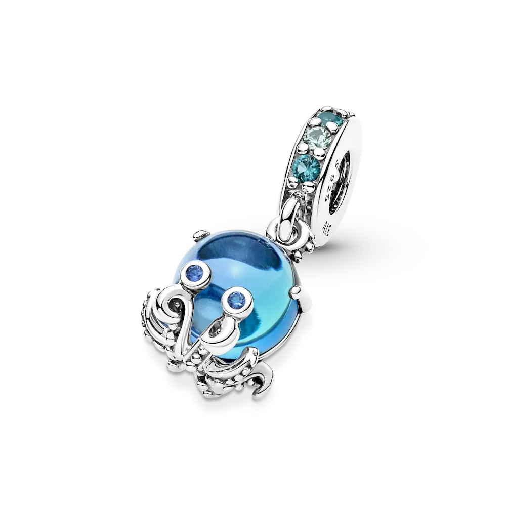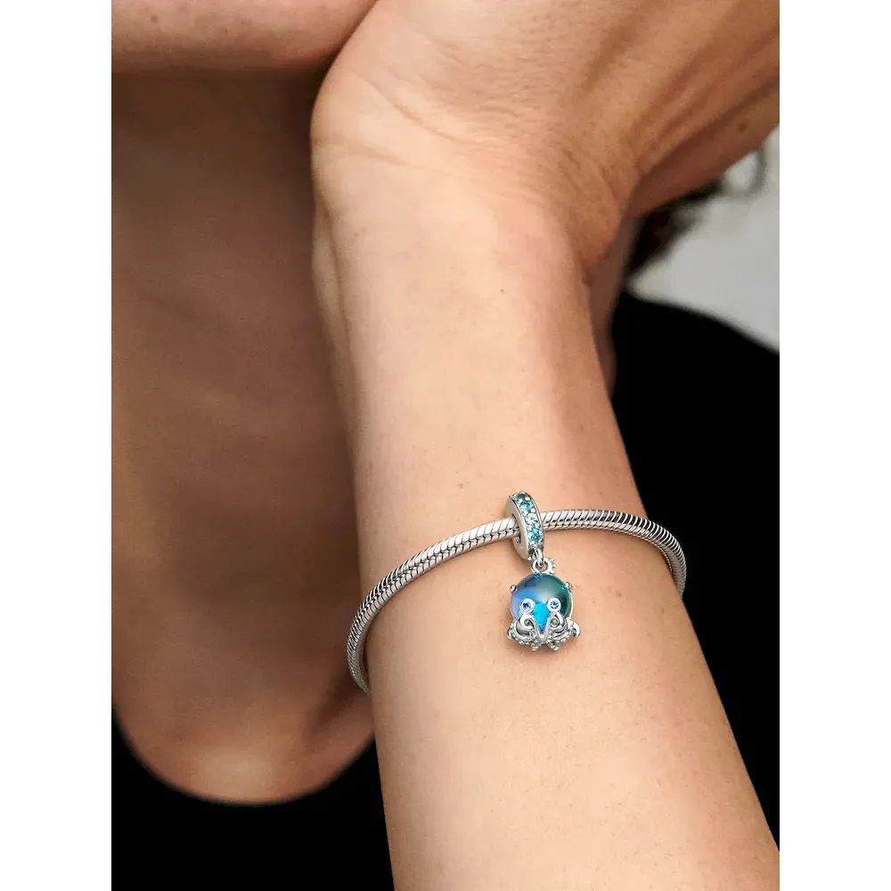 Explore the wonderful world of the deep blue sea and add this cute octopus charm to your Pandora Moments jewelry. This dangle charm features beautiful two-toned green and blue Murano glass with a wavy openwork pattern on the back in sterling silver. The sterling silver tentacles are curled up, showing the playful nature of this friendly and mysterious ocean creature. Man-made crystals in three shades of blue bring some extra sparkle to the bail and the octopus’s eyes.