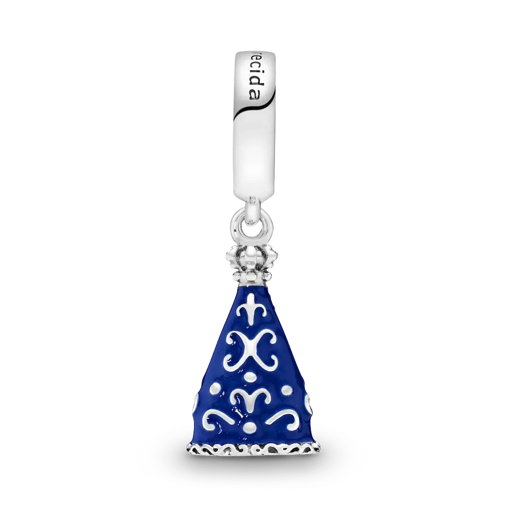 The principal patroness of Brazil, Our Lady of Aparecida is a famed clay statue and religious icon. Our sterling silver dangle charm is shaped to resemble the Catholic effigy and detailed with a blue enamel robe and beaded crown. Engraved with
