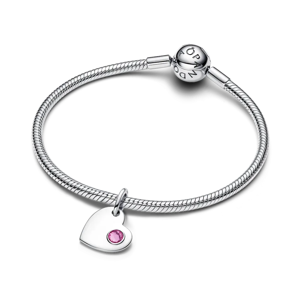 October babies, wear your birthstone color close to your heart. This sterling silver set includes a necklace and a dangle heart charm set with a pink man-made crystal.