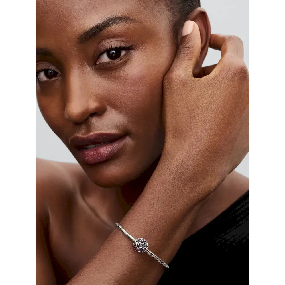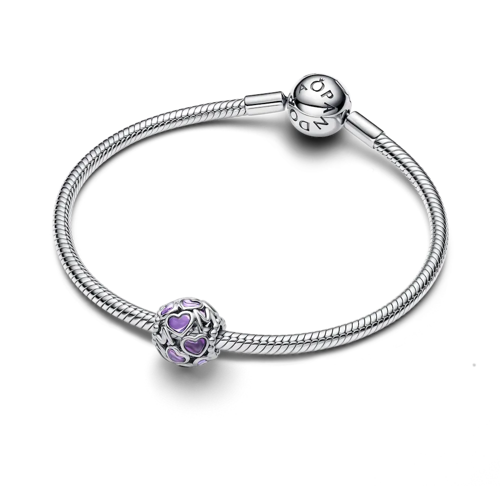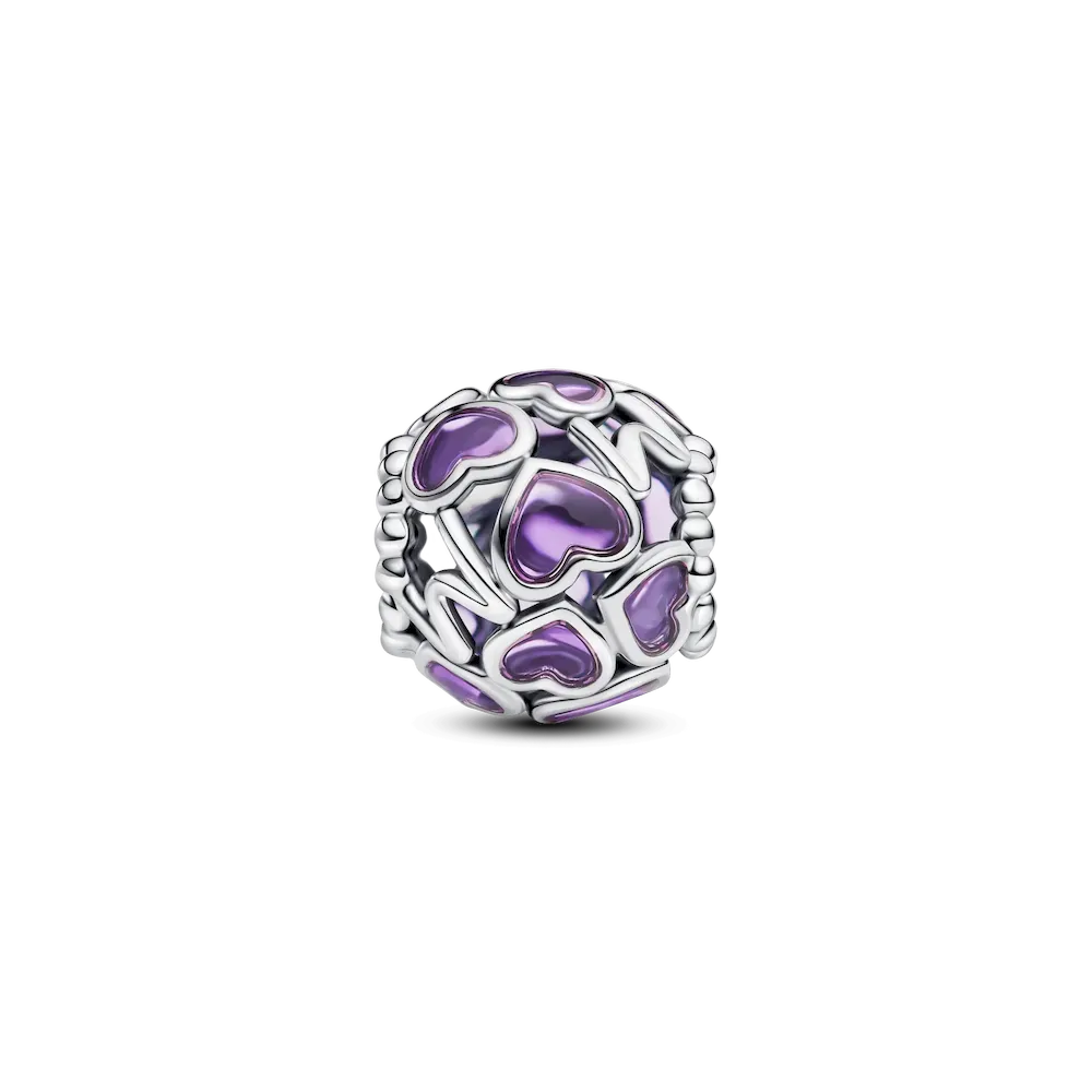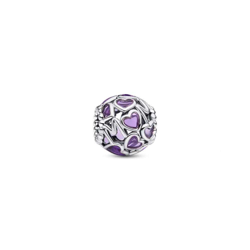 Add a cool-toned accent to your look with the Openwork Hearts Mom Charm. Transparent lavender enamel hearts with sterling silver borders form a round charm, which also features microbeads and the word
