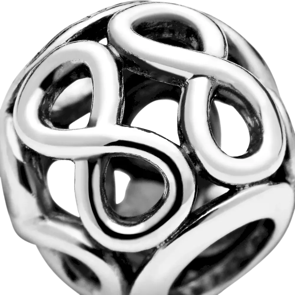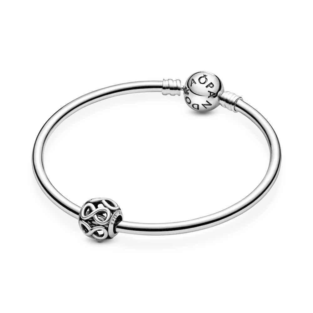 Take your look to infinity and beyond with this stylish infinity charm in sterling silver. A charm to wear now and forever, the openwork charm is sculpted into infinity shapes and adds a meaningful touch to your look. The hand-finished design is made to be worn on our Pandora Moments bracelets and bangles and makes for a perfect addition to your curated collection of meaningful charms.