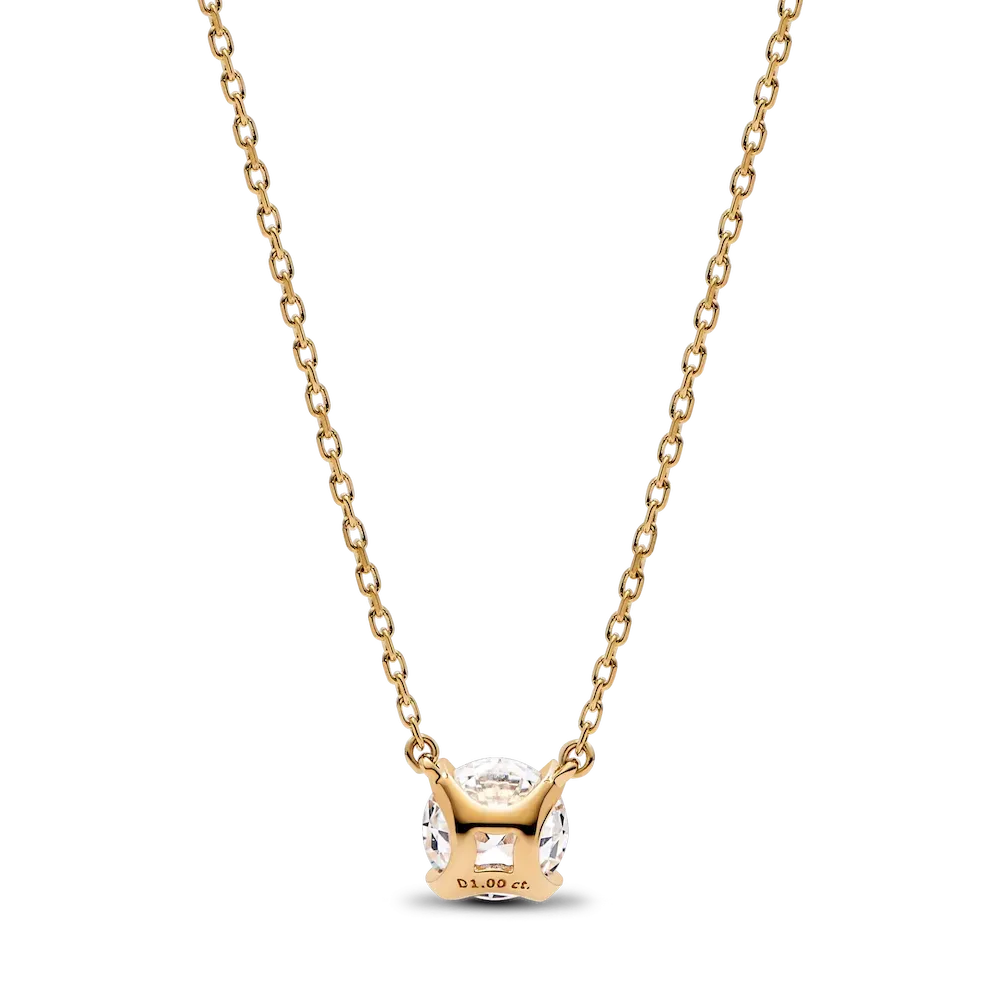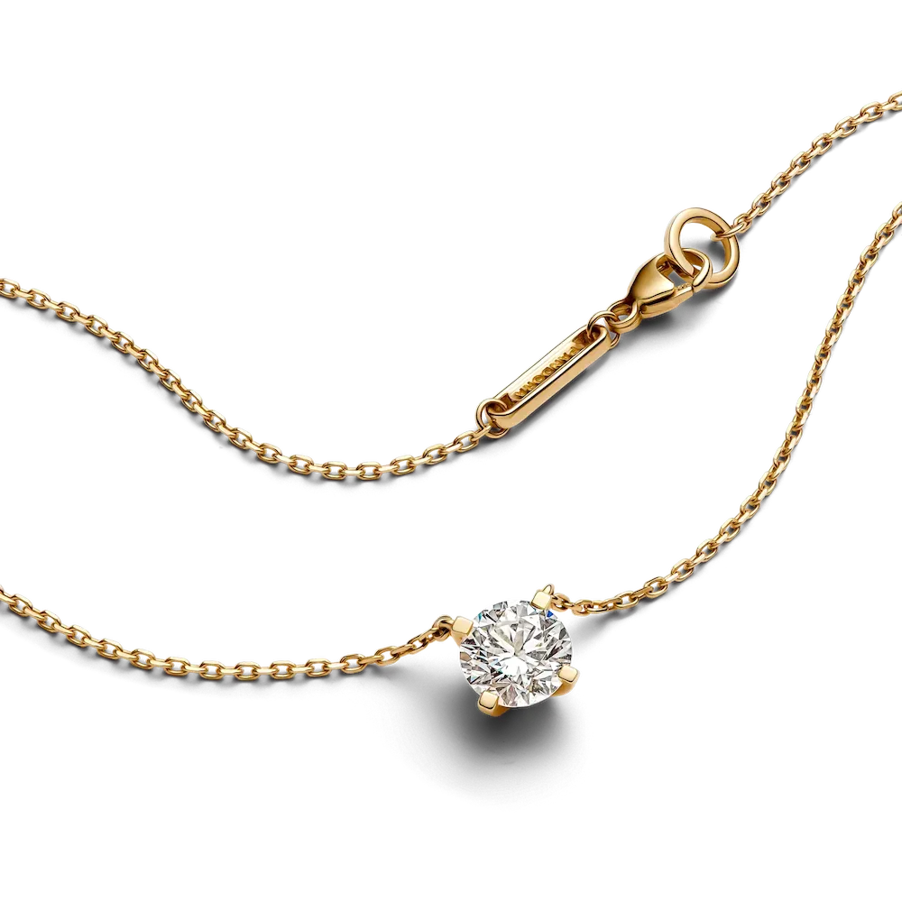 A fresh twist on a classic. The Pandora Era 14k Gold Lab-grown Diamond Pendant Necklace showcases a 1.00 carat round brilliant excellent cut lab-created diamond in a four-prong setting that combines round and flat profiles, creating a modern aesthetic and opening the stone to the light for amplified sparkle. The 14k gold pendant is fixed to a matching diamond-cut cable chain, adjustable to two lengths. This lab-grown diamond necklace is a universally wearable piece that will elevate your looks day and night for years to come. Each Pandora Lab-grown diamond is treated with a post-growth color enhancement called annealing.