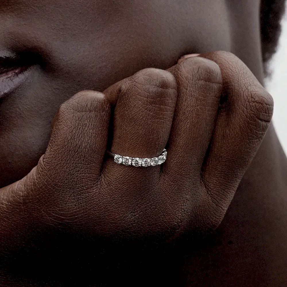 Let the light in, with this radiant lab-grown diamond ring from our Pandora Era collection. A 14k white gold band is encrusted with a row of nine lab-grown diamonds, fitted to the band with prong settings that hold the diamond diagonally, allowing maximum light refraction to enhance sparkle. Whether you’re treating yourself or surprising someone special, this is a ring to love for a lifetime. To ensure our rigorous standards of quality in color and clarity, each lab-grown diamond has undergone an additional high heat and pressure treatment prior to cutting and polishing.