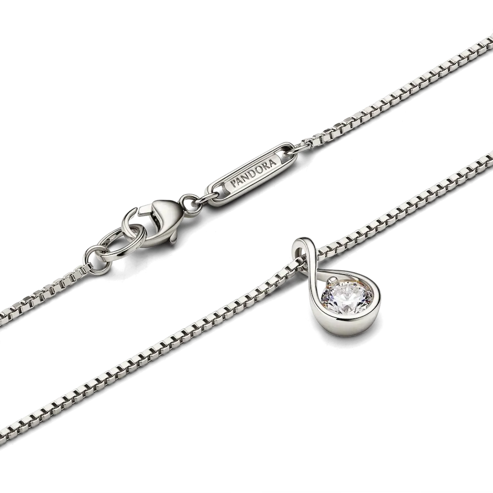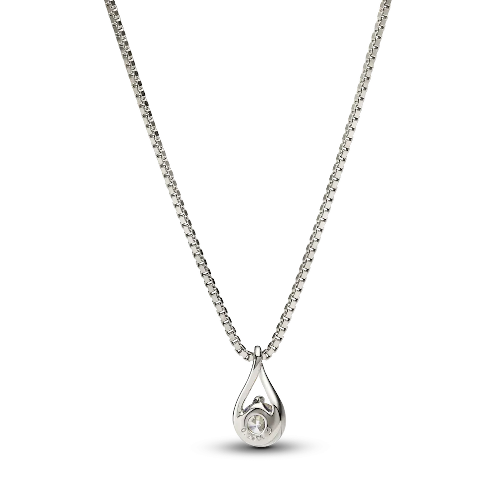 This 14k white gold pendant is hand-set with a radiant 0.25 carat lab-grown diamond on a matching 14k white gold box chain necklace. A powerful reminder of all we are, all we can be and the infinite possibility the future holds, this pendant features a round brilliant excellent cut lab-grown diamond in a modern infinity setting that flows around the stone and suspends it in mid-air. An elevated piece that will shine on any neckline. Each Pandora Lab-grown diamond is treated with a post-growth color enhancement called annealing.