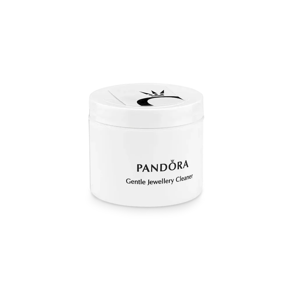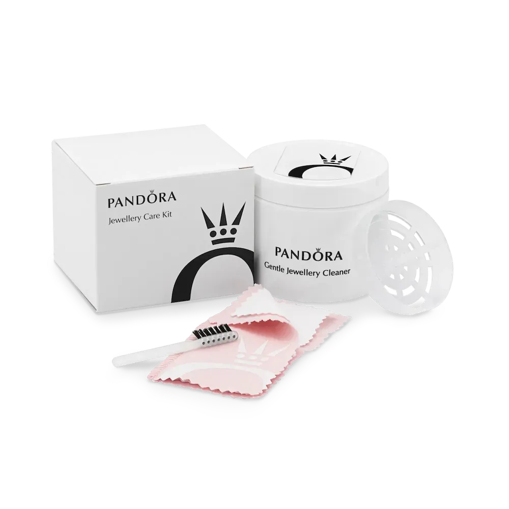 Here is the perfect kit to care for your Pandora jewelry, complete with instructions. The jewelry cleaner set contains a gentle Pandora-approved cleaning solution for all metals, a soft brush and a handling tray to hold your jewelry while cleaning it. The solution is safe for daily use, and perfect for cleaning away oils, dirt, and germs. Please note this cleaner does not remove tarnish and designer oxidation. There is also a double-sided polishing cloth: the white side is for sterling silver and 14k gold, and the pink side is for plated metals such as Pandora Roseâ„¢ and Pandora Shineâ„¢.