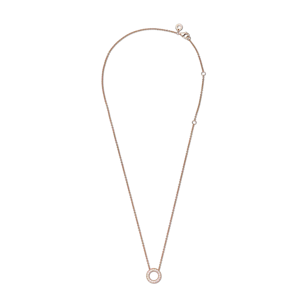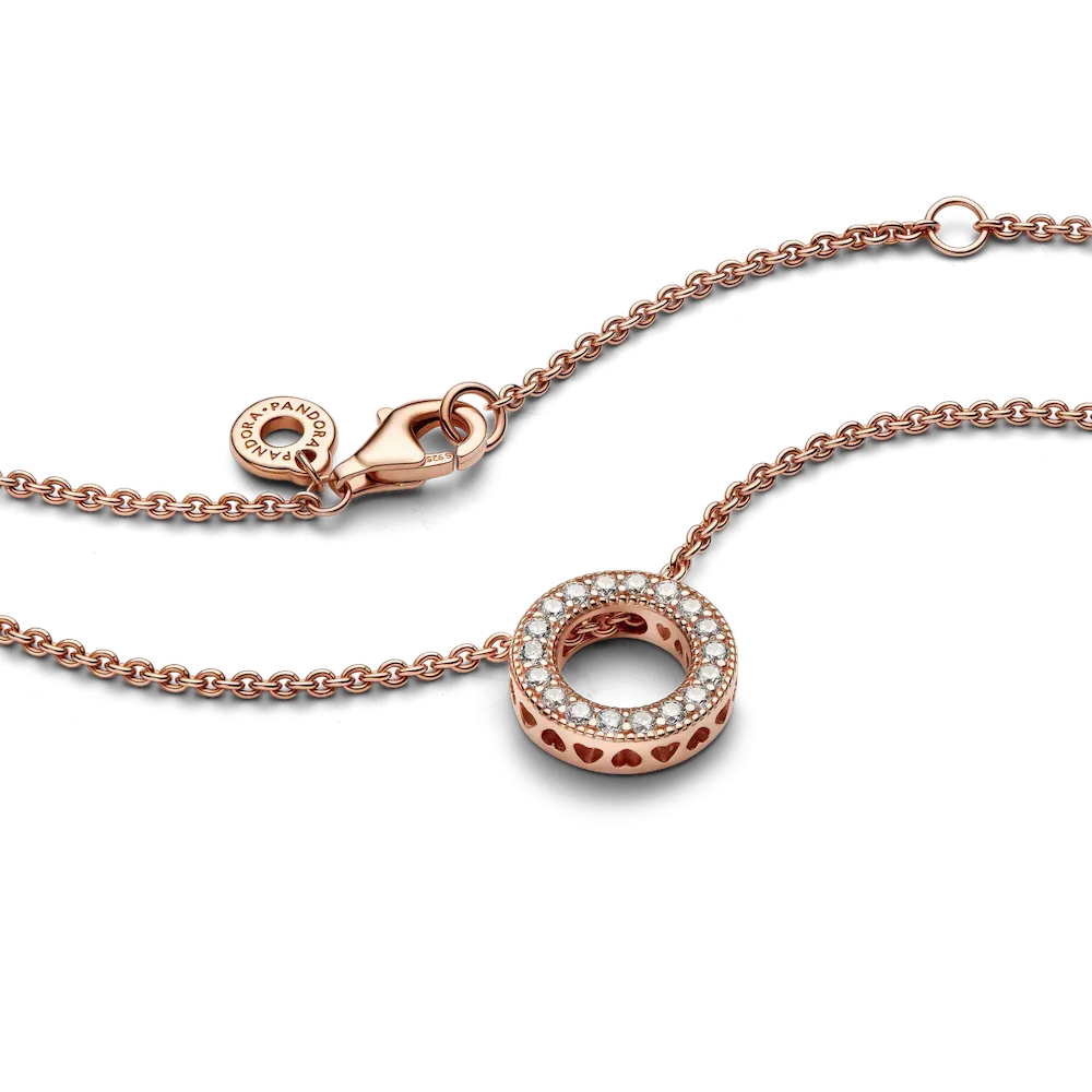 Celebrate the Pandora Signature range with the Pandora Logo Pavé Circle Collier Necklace. This 14k rose gold-plated reversible piece with an open centre is highly detailed and hand-finished. On one side of the circle, there are clear cubic zirconia. The polished reverse side features an engraving of the Pandora logo. With cut-out hearts on the sides of the circle, show your passion for classic design by wearing this adjustable Pandora logo necklace.