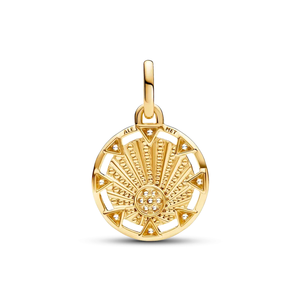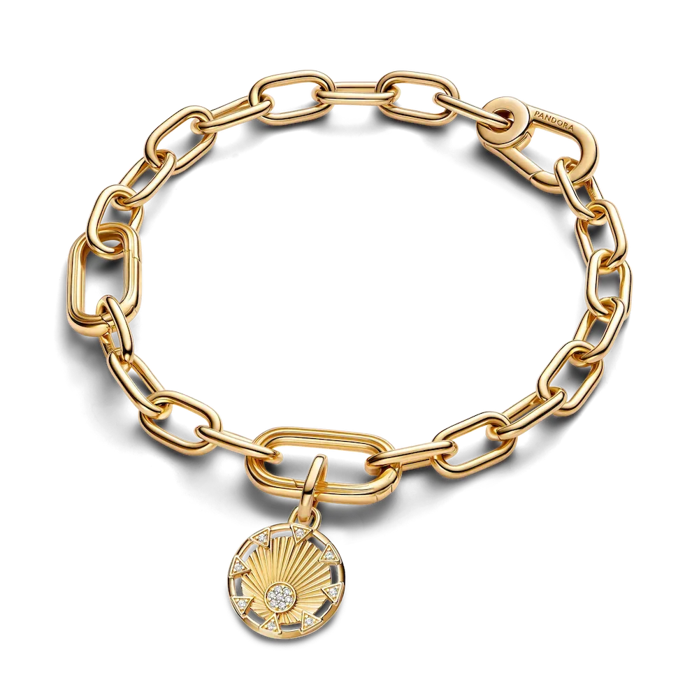 Be all light and no shade when you wear the Pandora ME Power of the Light Sun Medallion Charm. This 14k gold-plated medallion charm is embellished with details that represent the sun and its radiating rays. One side features sparkling stones pavé-set inside the sun and surrounding triangles; the other side boasts microbead rays and cut-out triangles. Accessorise this piece with sleek, linear Pandora styles to make this statement medallion charm shine even brighter. Compatible with Pandora ME and Pandora Moments.