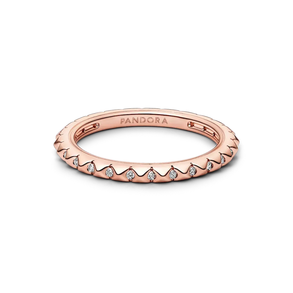 It’s rosé all day with the Pandora ME Pyramids Ring. This 14k rose gold-plated ring is punctuated by pyramid studs with clear cubic zirconia stones set between them. A grooved line along the edges of the ring adds a subtle, sleek design detail. Edgy yet elegant, this effortlessly cool piece will become a go-to option that works with everything, inspiring you to customise a fresh look every day.