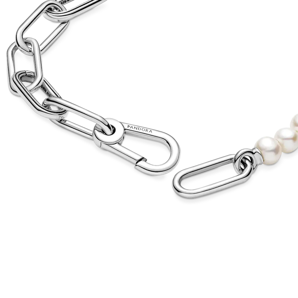 Pearls, reimagined: this sterling silver Pandora ME Treated Freshwater Cultured Pearl Bracelet takes the iconic pearl and turns it into a design with endless personalization potential. The bracelet features two openable links – designed with grooved surfaces to set them apart – that link to a row of ethereal treated freshwater cultured pearls and a carabiner clasp closure. Customize your link chain first: one set of interlocking styling links can be swapped out for one styling double link or one styling link – keep the original length or adjust it to suit you. Once you’ve curated your link chain, style up to two medallion charms on your openable links, or up to eight mini dangle charms to show the world who you are. NOTE: the relevant treatments for treated freshwater cultured pearls are bleaching or dyeing and luster enhancement. Discover how to mix and re-mix your Pandora ME look here.
