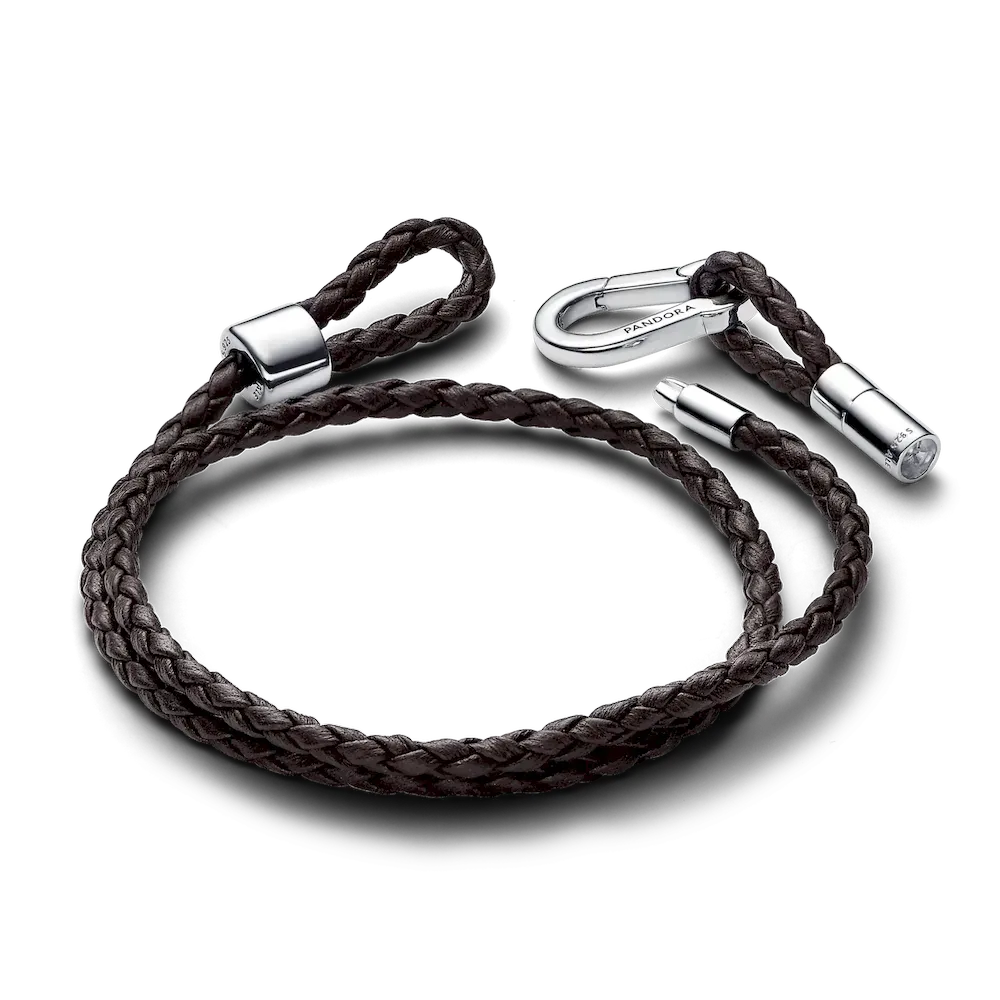 Earthy meets edgy in the Pandora Moments Brown Braided Double Leather Bracelet. Braided brown leather wraps around twice and closes with a sterling silver carabiner clasp that has a Pandora logo engraved on both sides. Adjust the bracelet using a sliding metal cap on one end of the bracelet; add and secure charms using an openable metal cap on the other end. Customise this contemporary, super wearable bracelet with up to 16 to 18 charms or dangle charms.