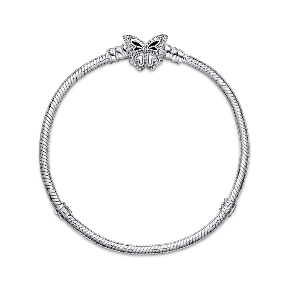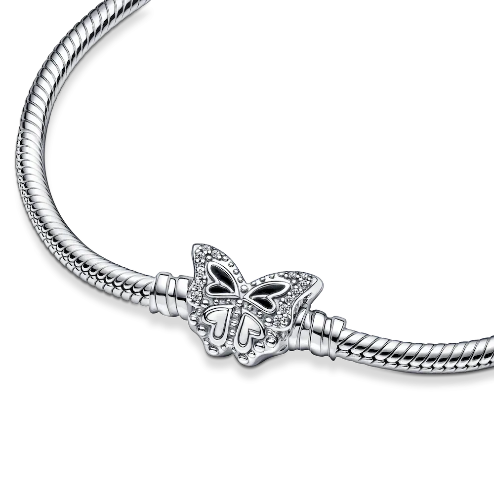 Tell your spring story and be inspired by the season of transformation with our sterling silver Pandora Moments Butterfly Clasp Snake Chain Bracelet. Cut-out and raised heart details and sparkling bead-set round brilliant-cut clear cubic zirconia give depth and dimension to the butterfly’s wings. Style up to 18 charms on the bracelet and carry spring moments with you wherever you go. Pair it with other sterling silver pieces, like our Blue Butterfly Hoop earrings.