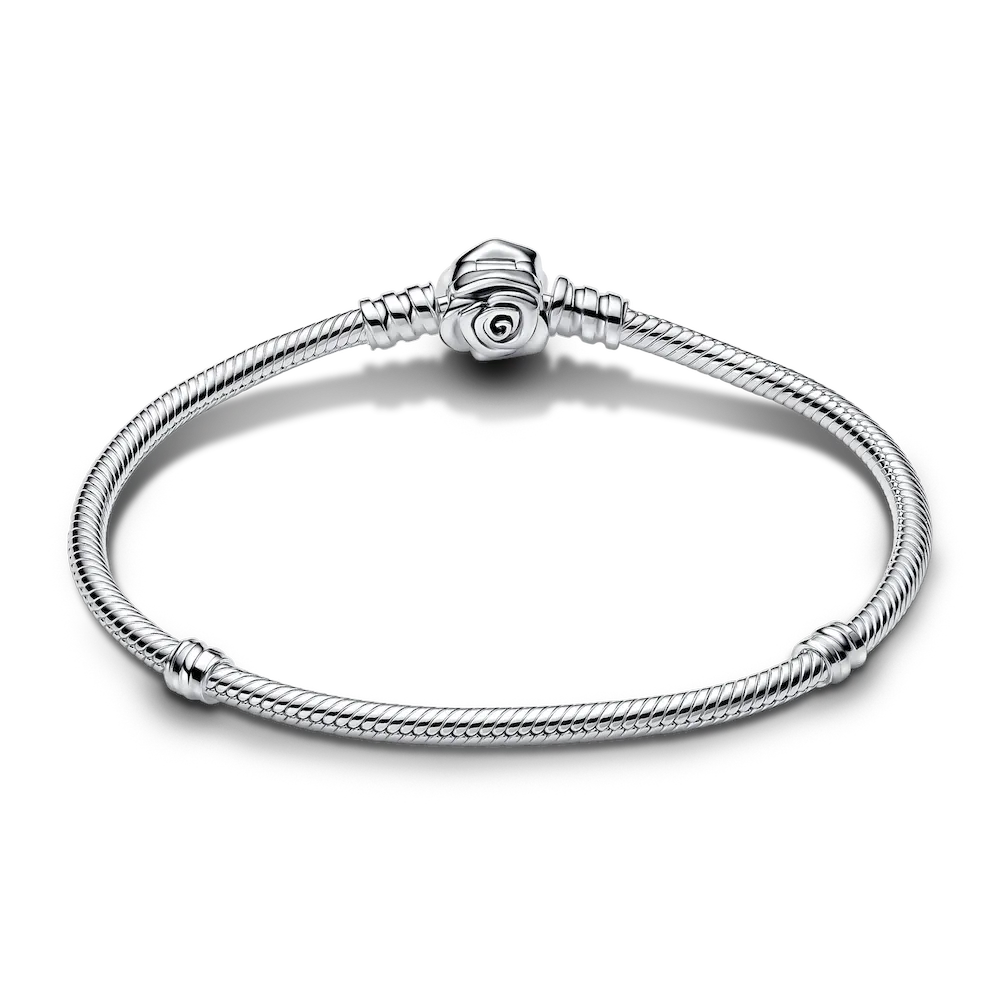 Capture the feeling of romance with our Pandora Moments Rose in Bloom Clasp Snake Chain Bracelet. Crafted in sterling silver, the bracelet is more than a jewelry style, it’s an expression of love. The intricately designed rose clasp with its layered petals adds a touch of floral elegance and symbolism. Versatile and stylish, it accommodates 16-18 charms, divided by functional threaders that allow you to space out your charm collection. Wear it as a reminder of the love you have in your life or gift it to someone you care about.