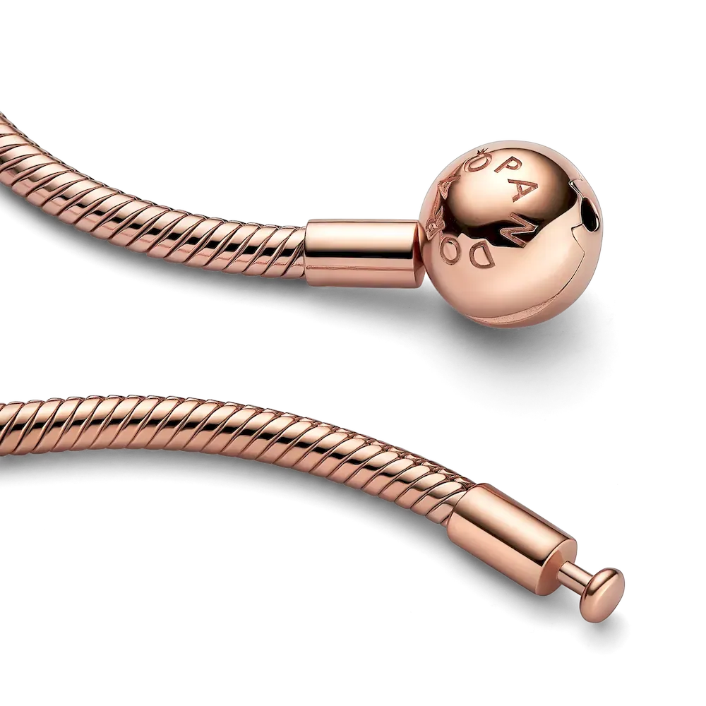 Say hello to your new jewelry box staple with the Pandora Moments Snake Chain Necklace. Hand-finished with 14k rose gold plating, this simple yet elegant design features Pandora’s iconic snake chain pattern and a ball clasp embossed with the Pandora logo. Wear it on its own or style with a Pandora O Pendant and keep your favorite charms close to your heart.