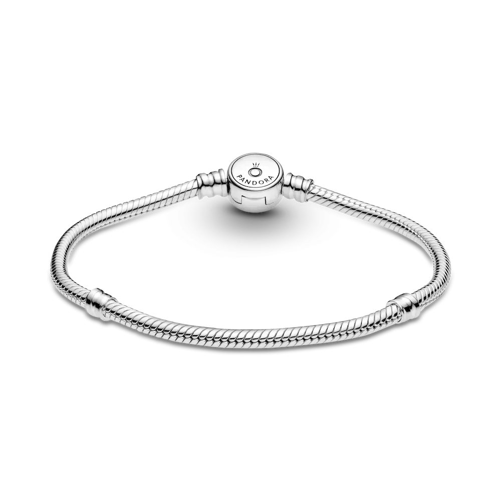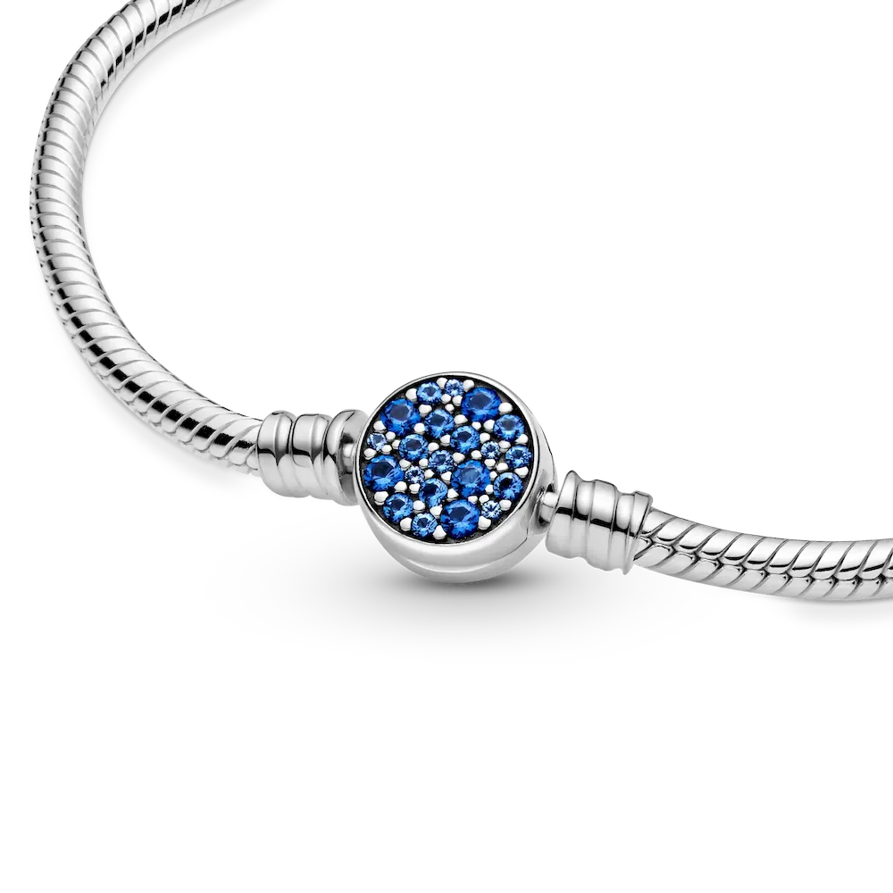 For a hint of color, look to the Pandora Moments Sparkling Blue Disc Clasp Snake Chain Bracelet. Hand-finished in sterling silver, this piece features our iconic snake chain. The small disc-shaped clasp is decorated with sparkling blue stones in different sizes, with the polished reverse side including the Pandora Crown O monogram and logo. Pair with colorful charms for a vibrant addition to your look.