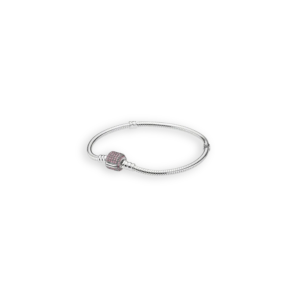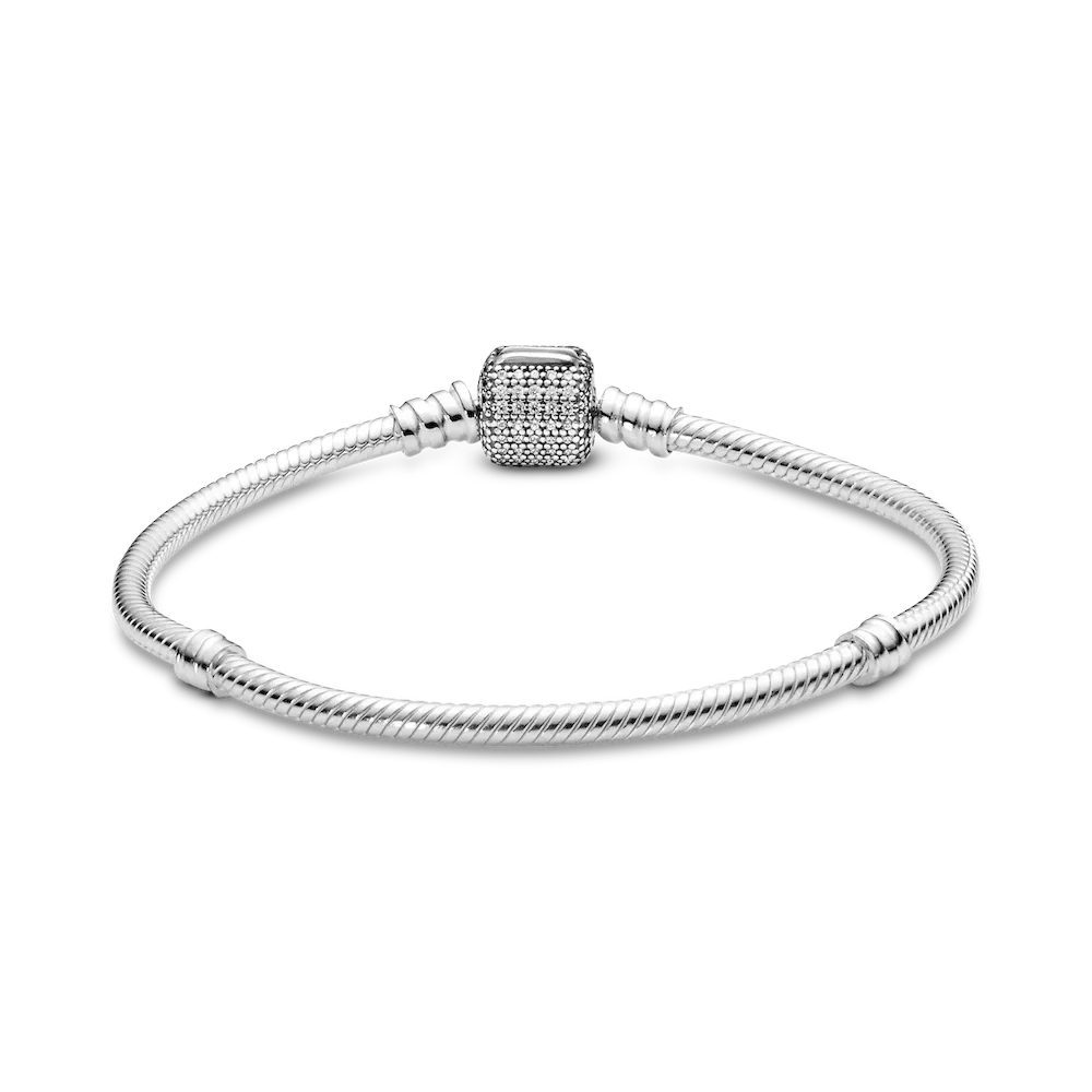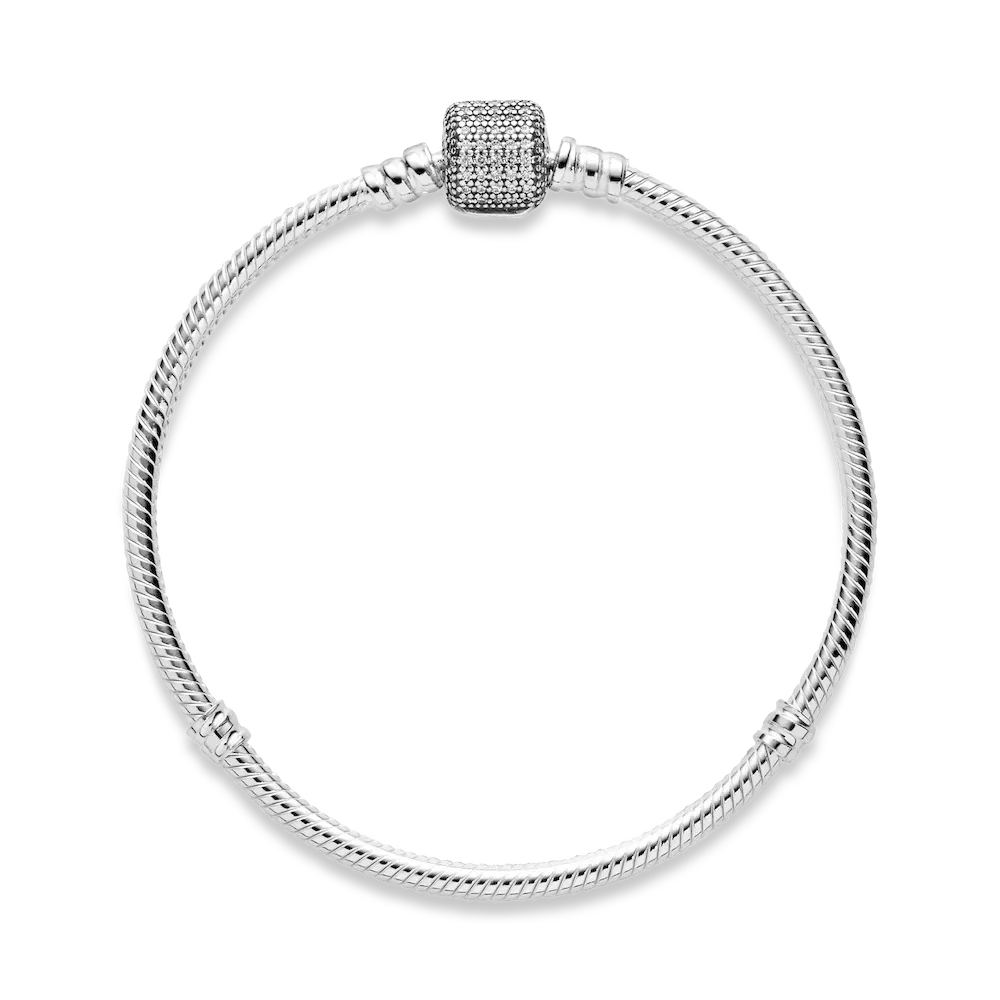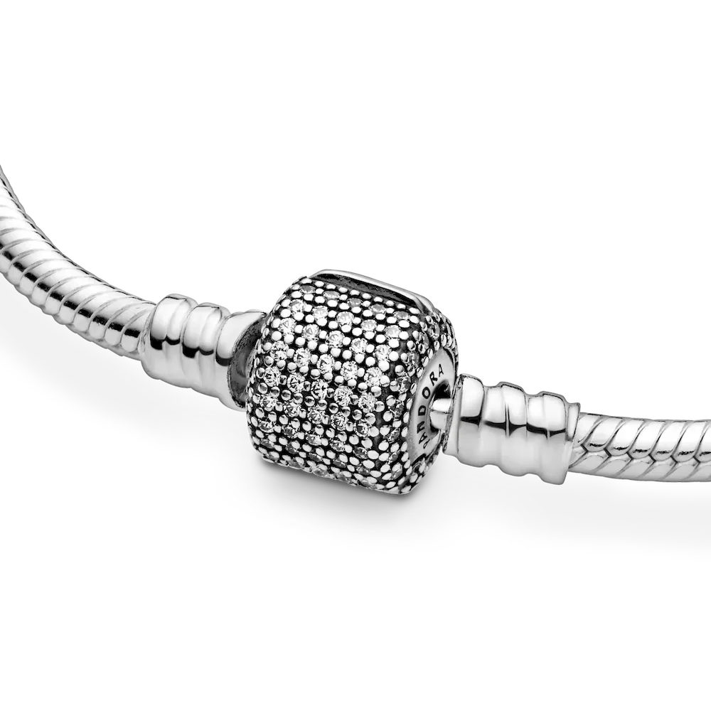The classic Pandora charm bracelet is given a glamorous upgrade with this sparkling pavé version. Crafted from sterling silver, this sleek snake chain bracelet features a barrel clasp set with sparkling cubic zirconia stones. Wear it solo or as a sophisticated carrier for your personal collection of Moments clips and charms.