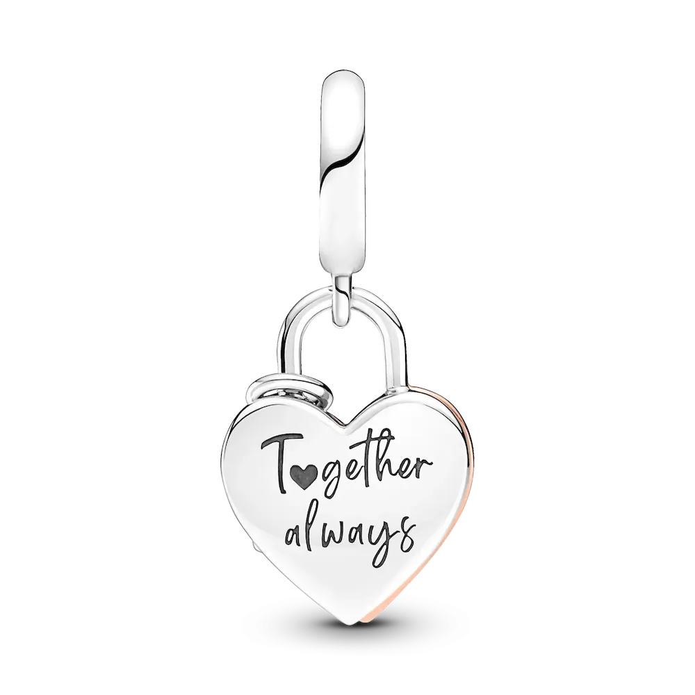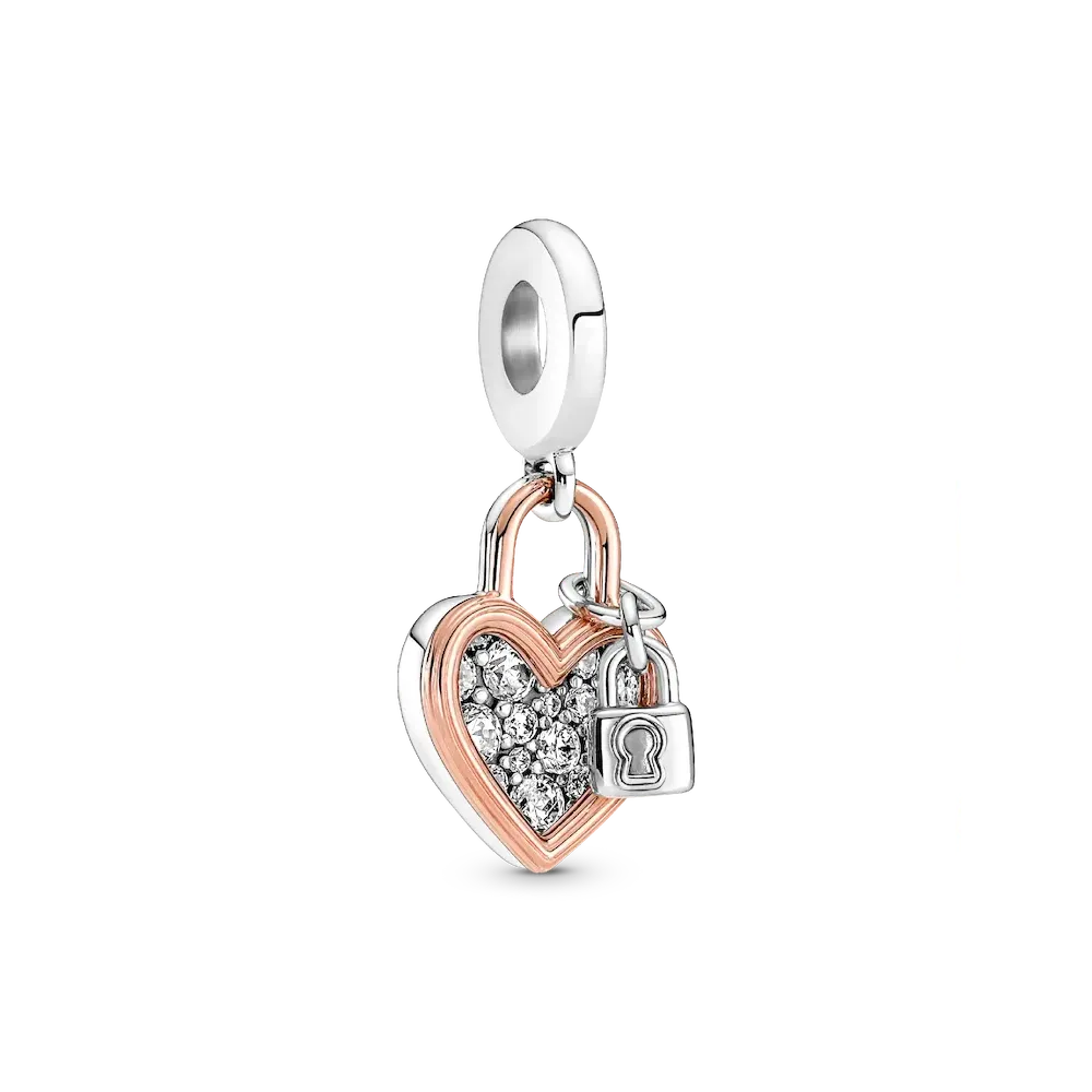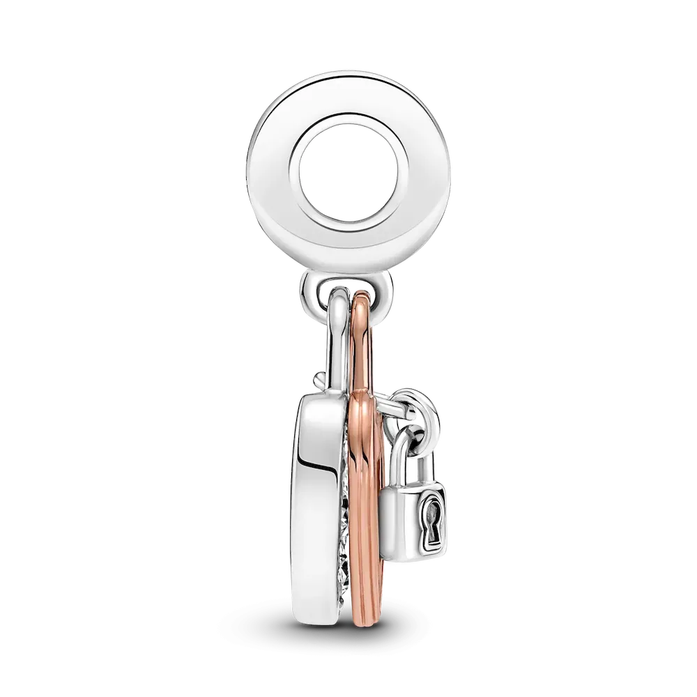 When hearts collide. This romantic set includes a sterling silver studded chain necklace with a flexible, textured chain and an infinity-detailed openable heart clasp that can be styled with up to 4-6 charms or dangle charms. Style it with your favorite charms and any size of Pandora O Pendants. It comes with a heart-shaped double dangle charm features an open heart silhouette in 14k rose gold plating, outlining a sterling silver pavé heart. It is decorated with a tiny padlock, inspired by the love locks that sweethearts place on bridges around the world. On the back heart-shaped disc, the engraving