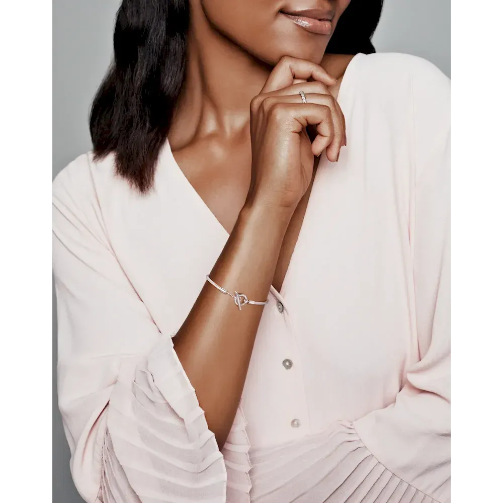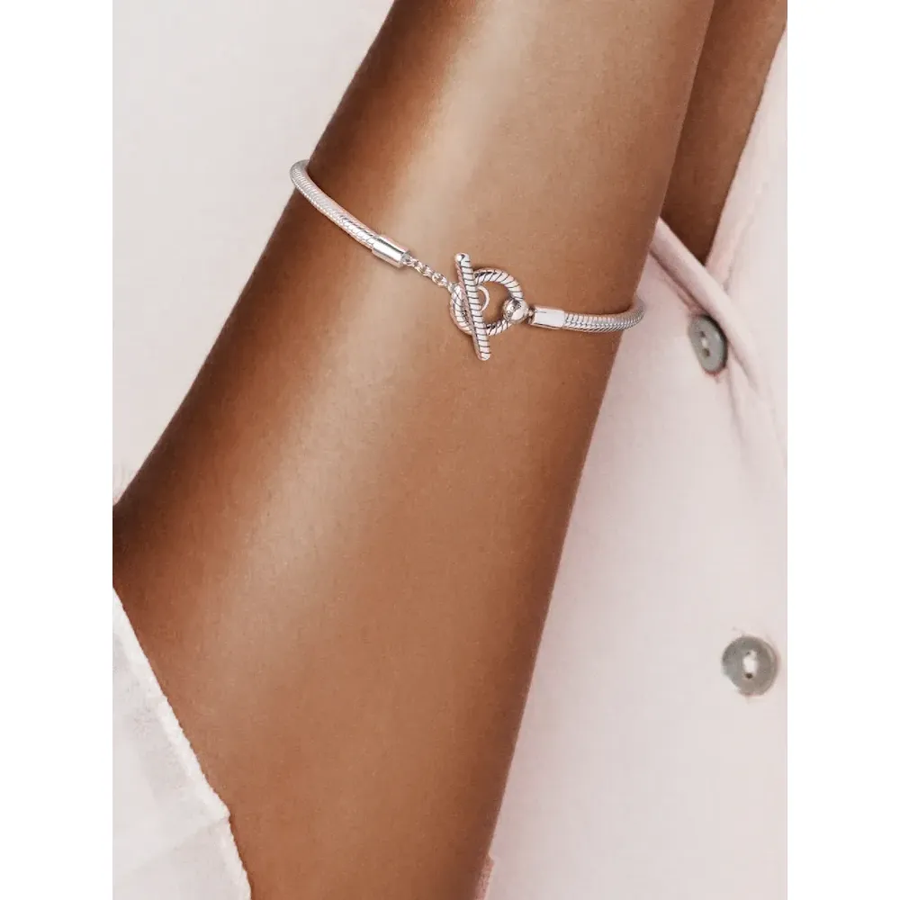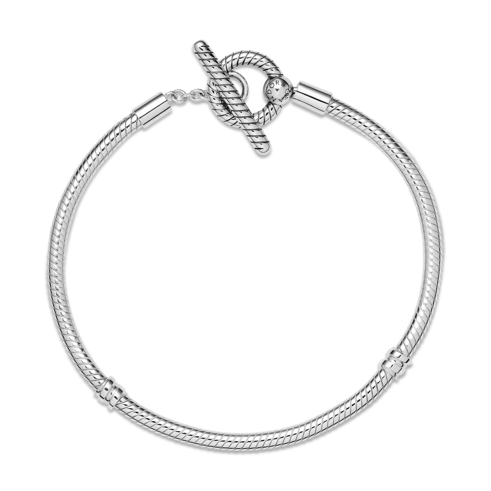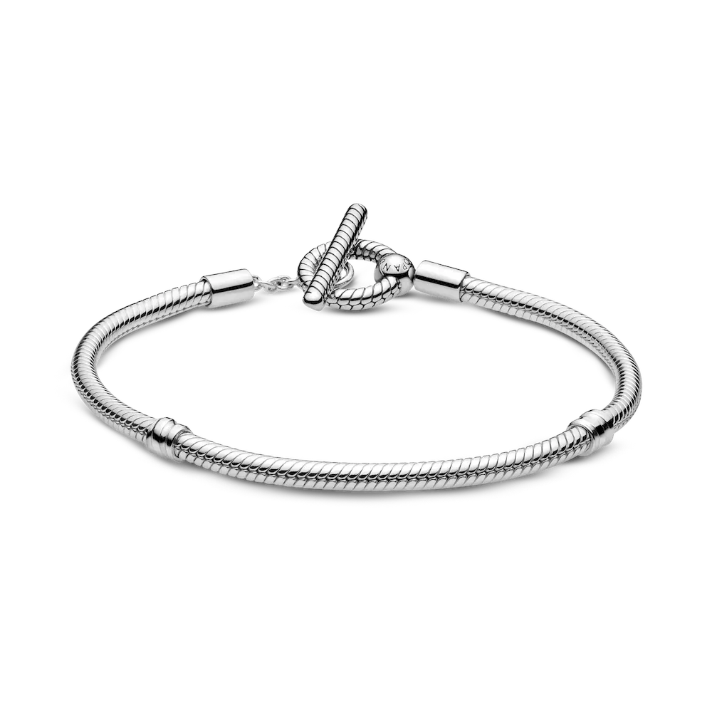 Build up your collection with the Pandora Moments T-Bar Snake Chain Bracelet. Hand-finished in sterling silver, this piece is an updated take on the iconic Pandora Moments snake chain bracelet. Featuring a T-bar double circle closure, loop the T-bar through the smallest circle to make sure that the bracelet clasp is securely closed. Including a snake chain pattern on the rigid parts of the bracelet, wear this piece with up to 15-20 Pandora Moments charms and dangles.