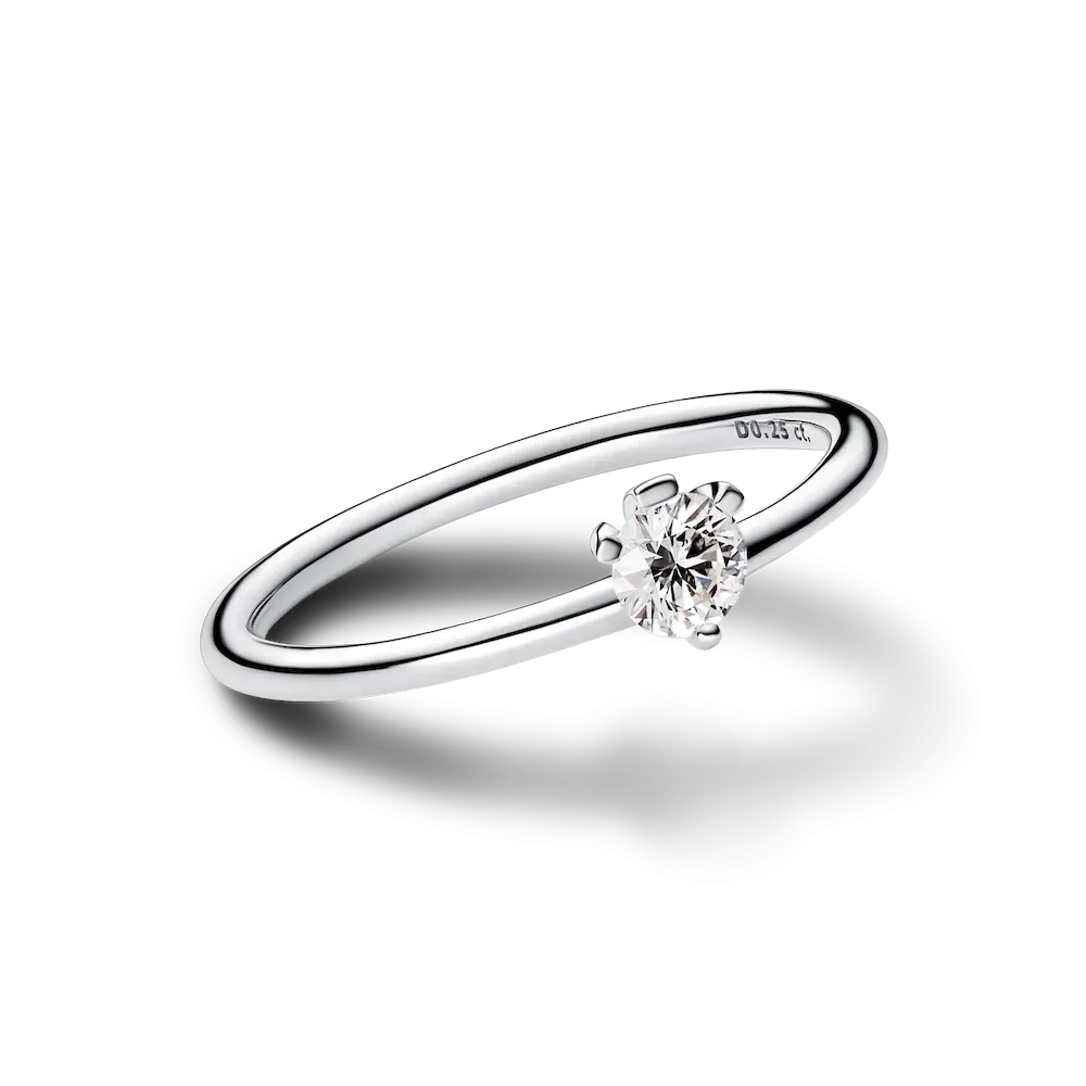Shine in the Pandora Nova Sterling Silver Off-set Lab-grown Diamond Ring. Inspired by the illusion of capturing and holding a precious fragment of light, this luminous lab-grown diamond ring features a 0.25 carat round brilliant excellent cut lab-grown diamond set in sterling silver. An asymmetrical prong setting frames the stone, letting in the light to amplify its sparkle. The setting is placed to one side of the ring band, giving this lab-grown diamond ring a modern, dynamic touch. Wear or gift it as a symbol of the unique light within all of us. Each Pandora Lab-grown diamond is treated with a post-growth color enhancement called annealing.