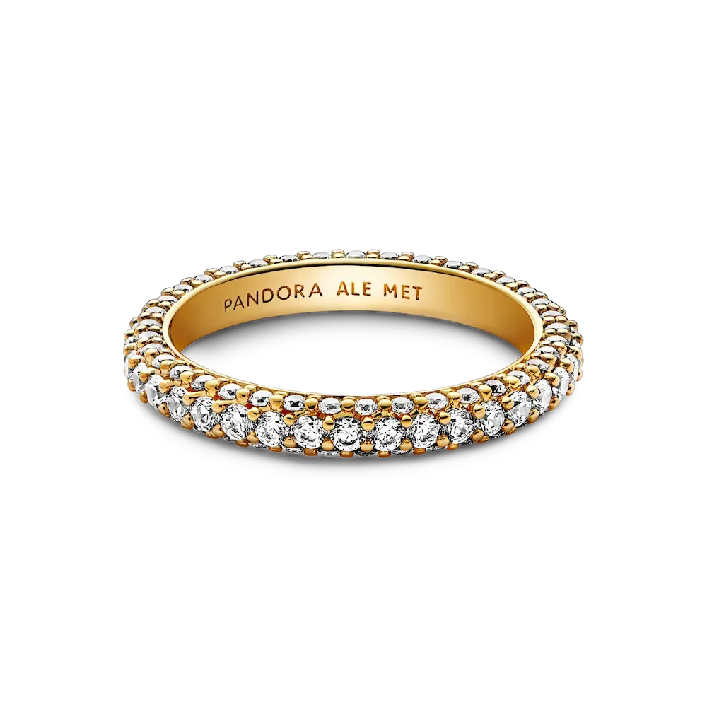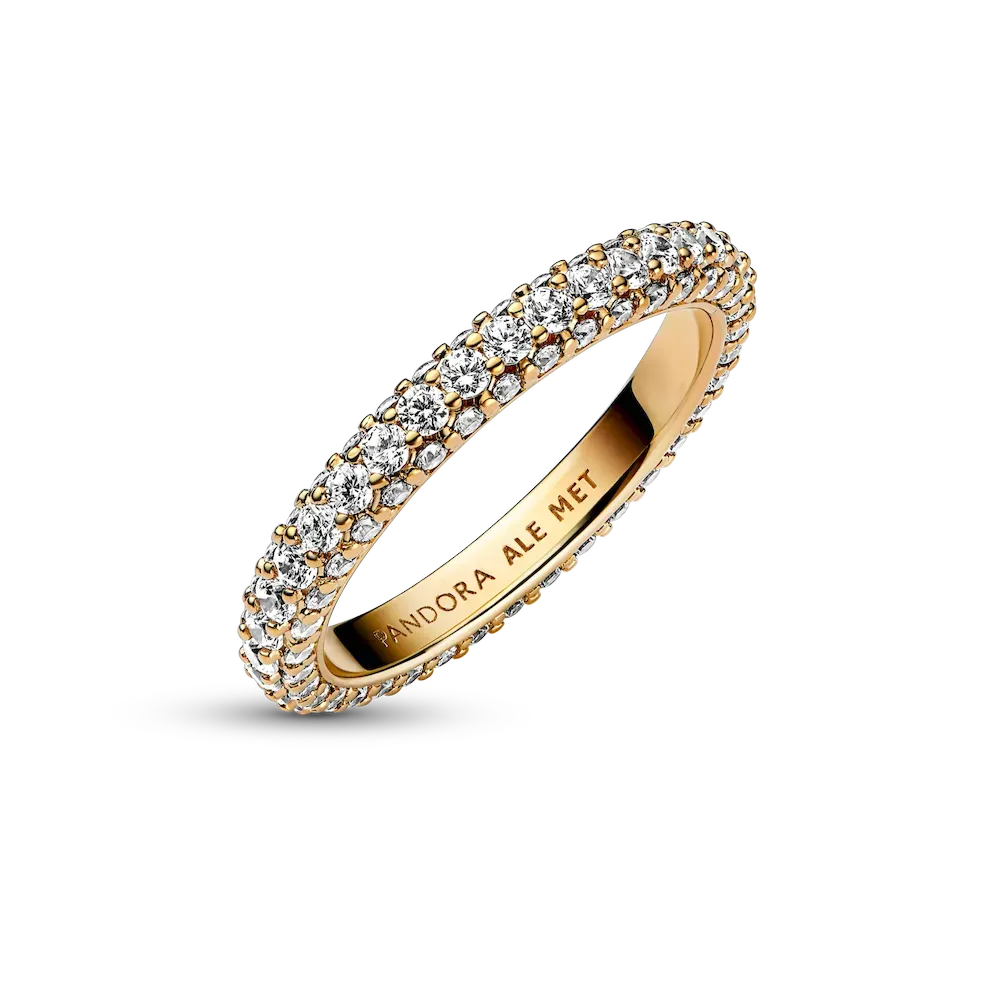 Stackable, radiant, timeless. Shining in 14k gold plating, our hand-finished Pandora Timeless Pavé Single-row Ring features one row of clear cubic zirconia around the center and one row facing outwards around each side, creating a slightly rounded square profile that sparkles from every angle. Style it on its own or with other Timeless Pavé pieces to create as much of a minimalist or maximalist effect as you want.