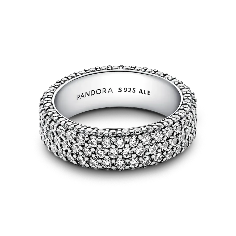 Maximize your sparkle with our hand-finished Pandora Timeless Pavé Triple-row Ring. Crafted from sterling silver, this stand-out ring features three rows of clear cubic zirconia around the center and one row facing outwards around each side, creating a slightly rounded square profile that sparkles from every angle. Wear it on its own or stacked with other Timeless Pavé rings to create as bold of a look as you want.