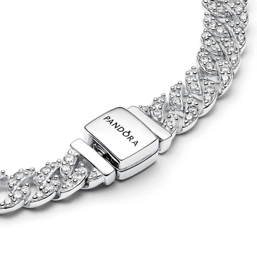 Elevate your look with this shining Cuban chain bracelet. The top side of the sterling silver bracelet is set with sparkling cubic zirconia, while the underside is polished for shine and comfort. The bracelet closes with a flat, square-shaped clasp.
