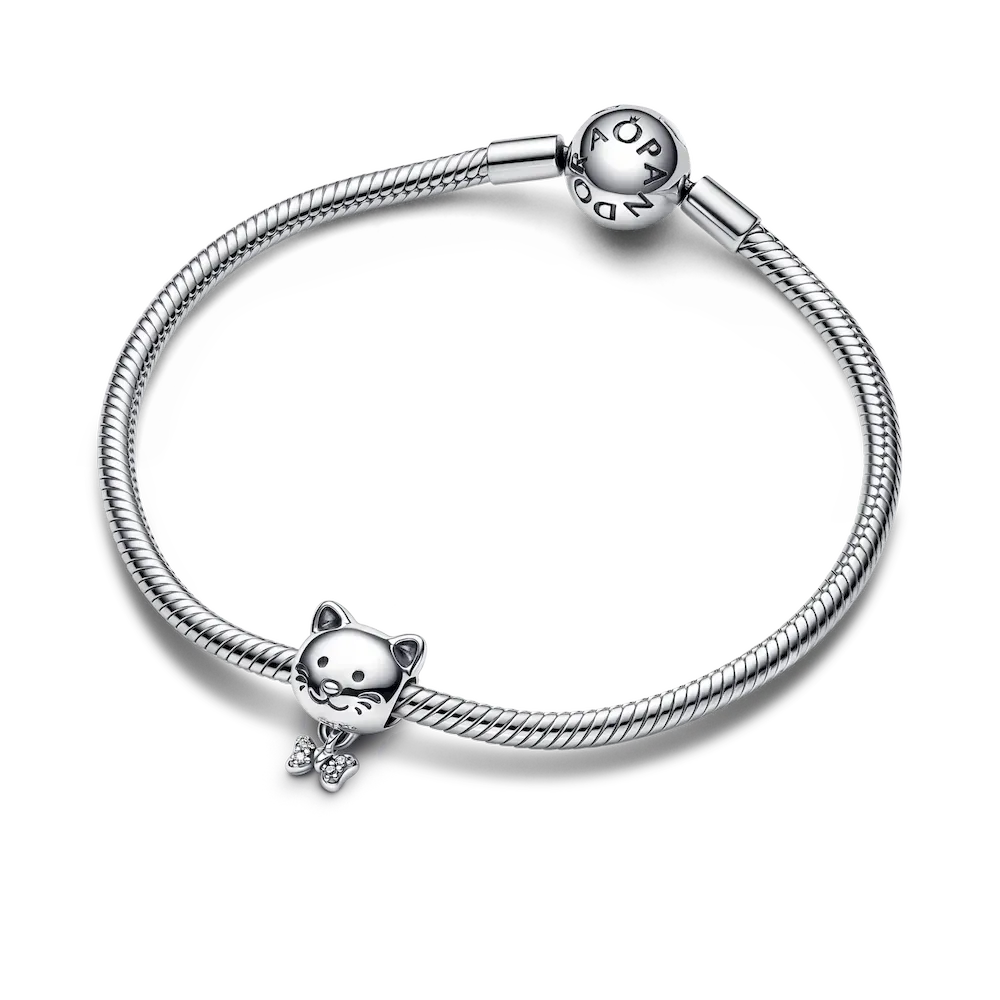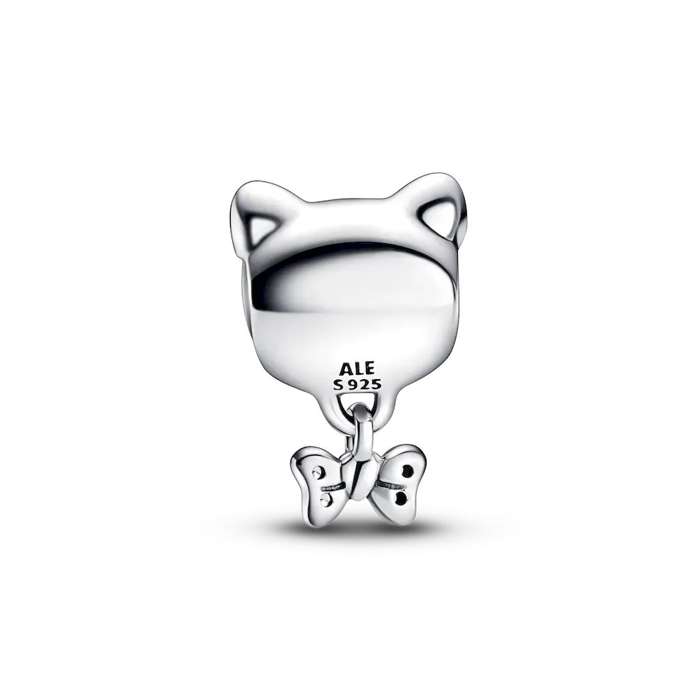 Let your love for your feline bestie shine with the Pet Cat & Bow Charm. Crafted from sterling silver, this retro piece with a modern touch is decorated with engraved lines on the face and sparkling pavé on the bow dangle. Wear it on a bracelet or charm holder to show your furry companion’s special place in your heart.