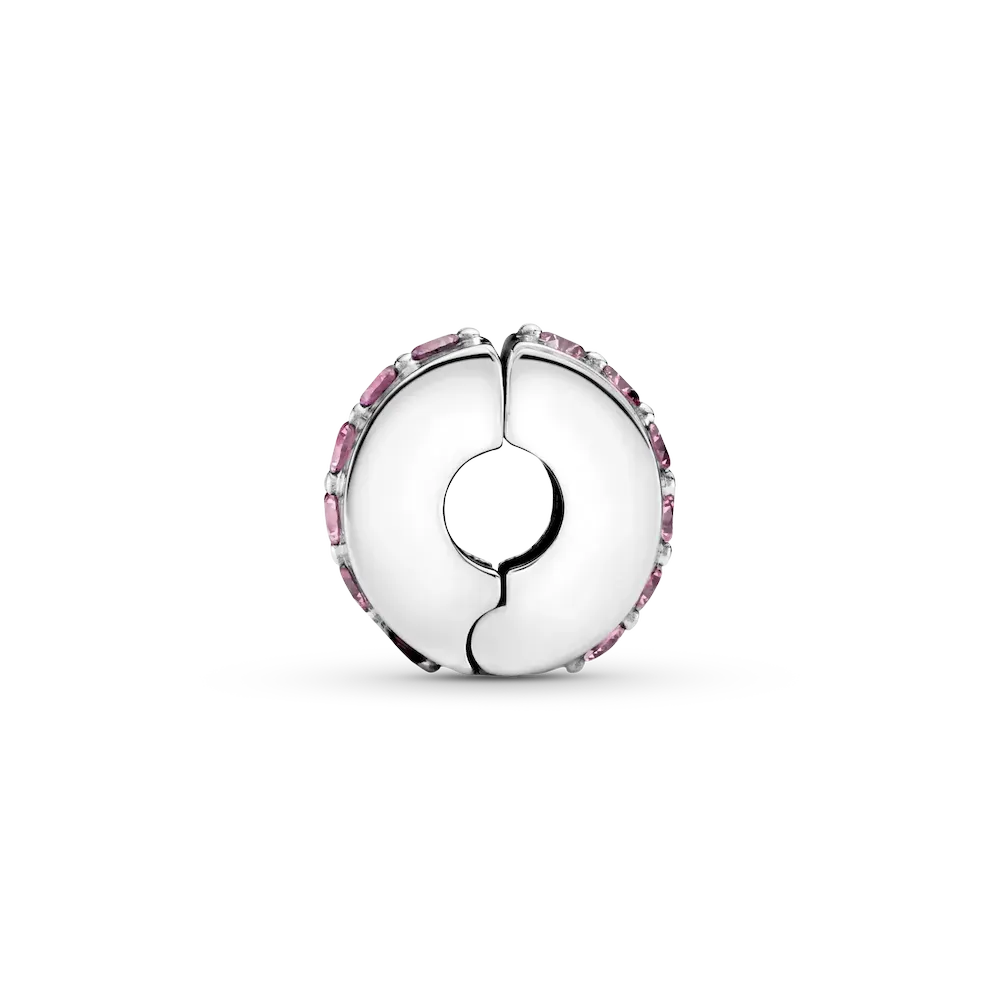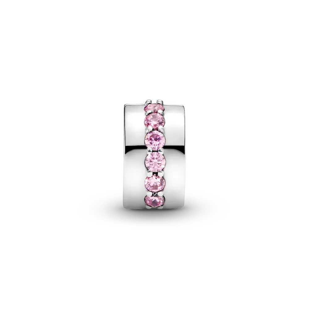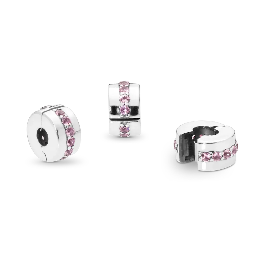 Add a touch of pink. This sterling silver clip charm has a row of pink pavé. This clip charm features no silicone grip, so it will slide if not styled onto threads (two raised charm dividers).