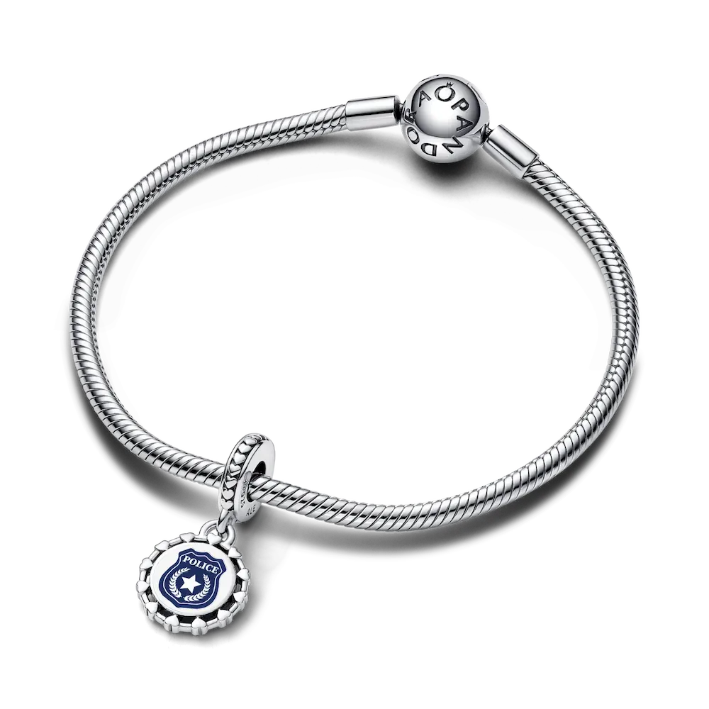 Honor the courage and sacrifice of law enforcement with this Engravable Police Dangle Charm in sterling silver. Featuring a row of hearts and a detailed blue police badge, it symbolizes bravery and service. Add a custom engraving on the back to make this meaningful charm uniquely yours—a perfect tribute to those who protect and serve.