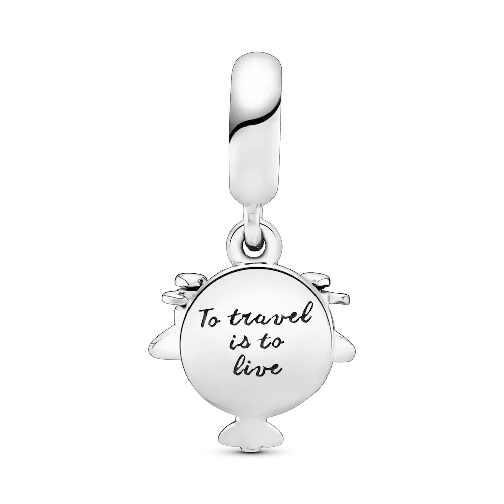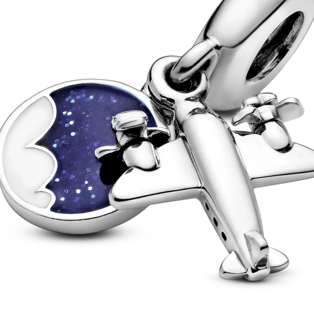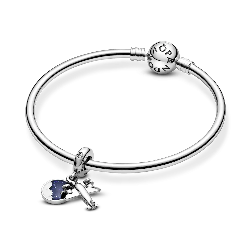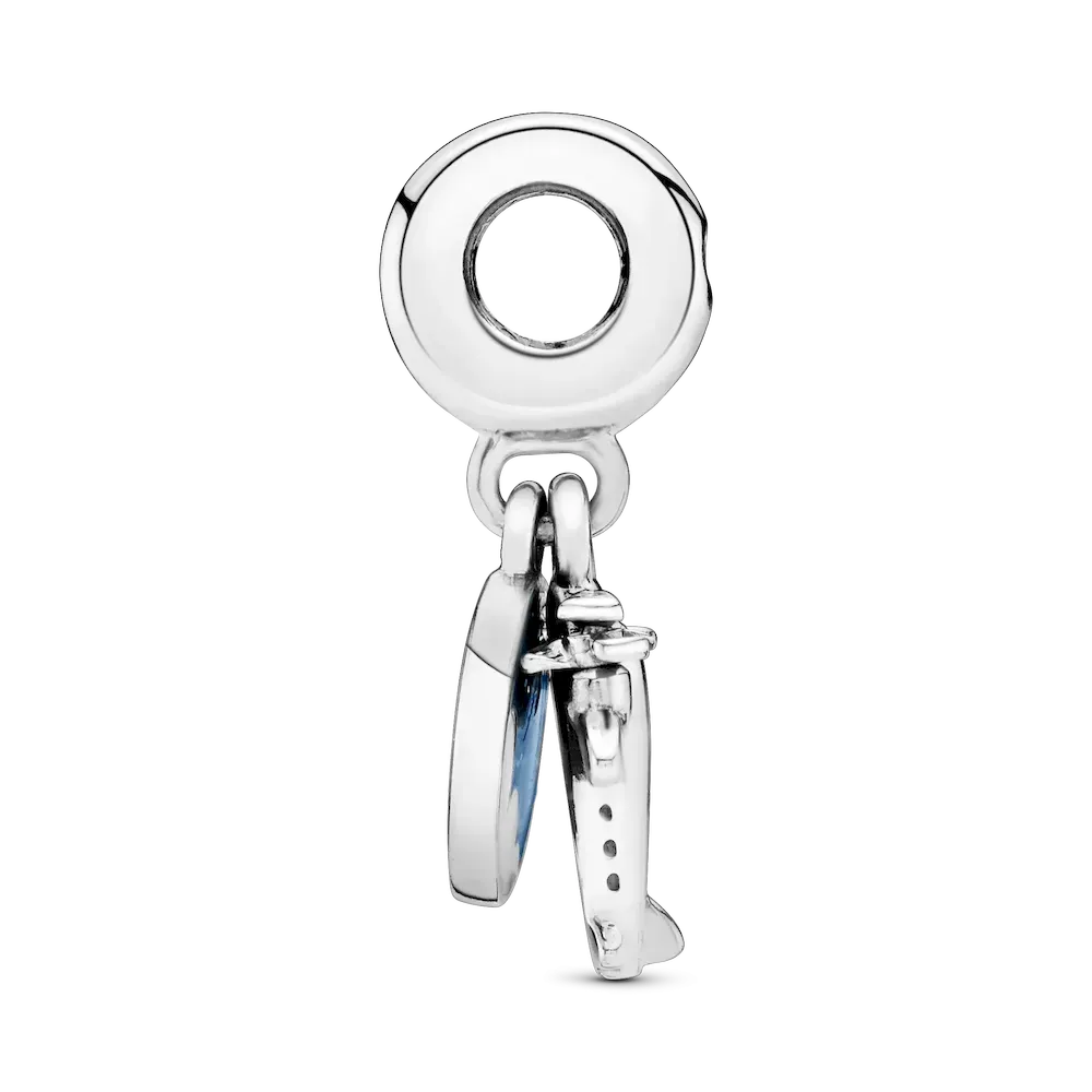 Take your style to new heights with this travel-inspired dangle charm, hand-finished in sterling silver. Made to be worn on our Pandora Moments charm bracelets and bangles, it’s shaped as an aeroplane and detailed with miniature propellers. The disc is decorated with hand-applied blue and white enamel and engraved with the words