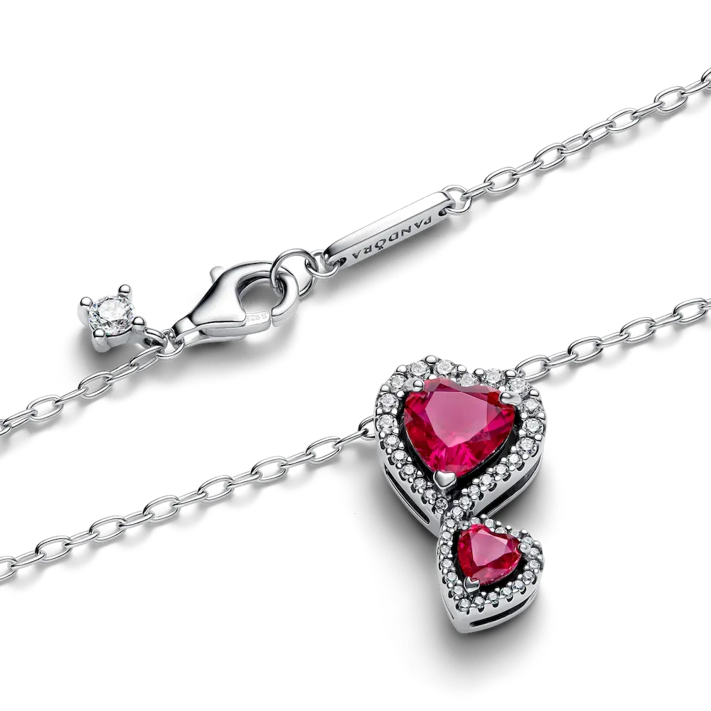 Wear a symbol of connection with the Red Halo Hearts Pendant Necklace, crafted in sterling silver. This sparkling piece features two prong-set heart-cut red man-made crystals, beautifully accented by a halo of pavé stones. The adjustable 60 cm cable chain allows you to style it at 55 cm or 50 cm, perfect for layering. Wear it to celebrate the deep connection of love.
