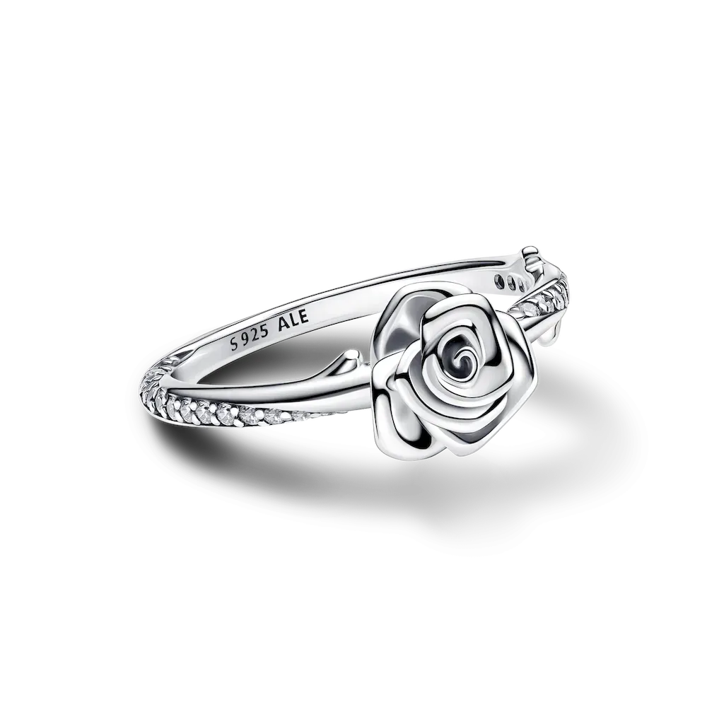 Crafted in sterling silver, the Rose in Bloom Ring represents the timeless gesture of gifting a rose to someone special. Blooming rose petals delicately layer on the ring’s surface, creating a stunning three-dimensional effect. The band, adorned with a swirling pavé row, radiates classic elegance. The raised thorns add a extra level of detail, turning a classic symbol into a unique statement. Inspired by the universally recognized symbolism of a rose, this ring captures the essence of love and makes for a great gift for someone close to your heart.