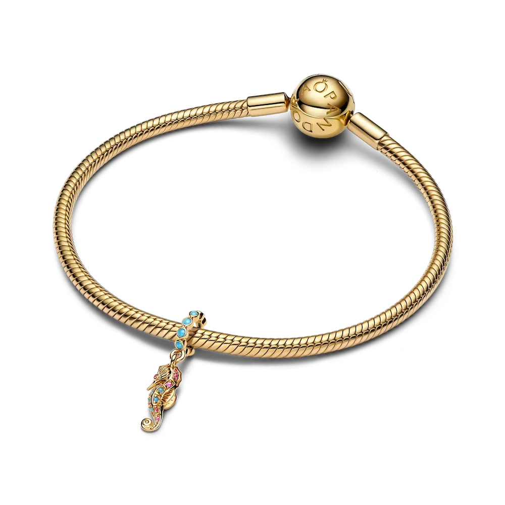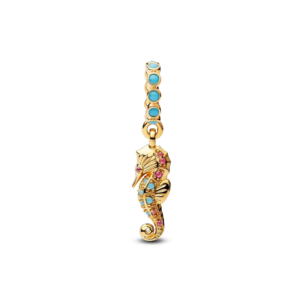 Celebrate the magic of the sea with a charming seahorse, symbolizing good luck and gentle strength, crafted with clear cubic zirconia, capri blue crystal, and phlox pink crystal.