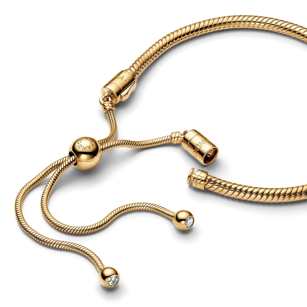 Our Pandora Moments Snake Chain Slider Bracelet is a sophisticated spin on the classic friendship bracelet. Crafted in 14k gold plating, it has two moveable end caps — both set with shimmering stones. An innovative sliding clasp makes it easy to adjust to your size. The perfect present for friends and loved ones, it can be styled by lifting either end cap and adding your favourite charms.