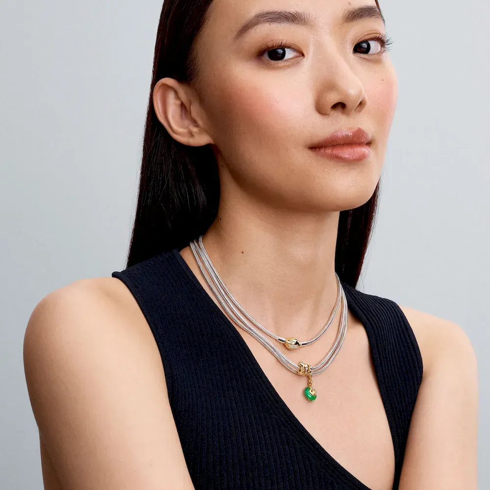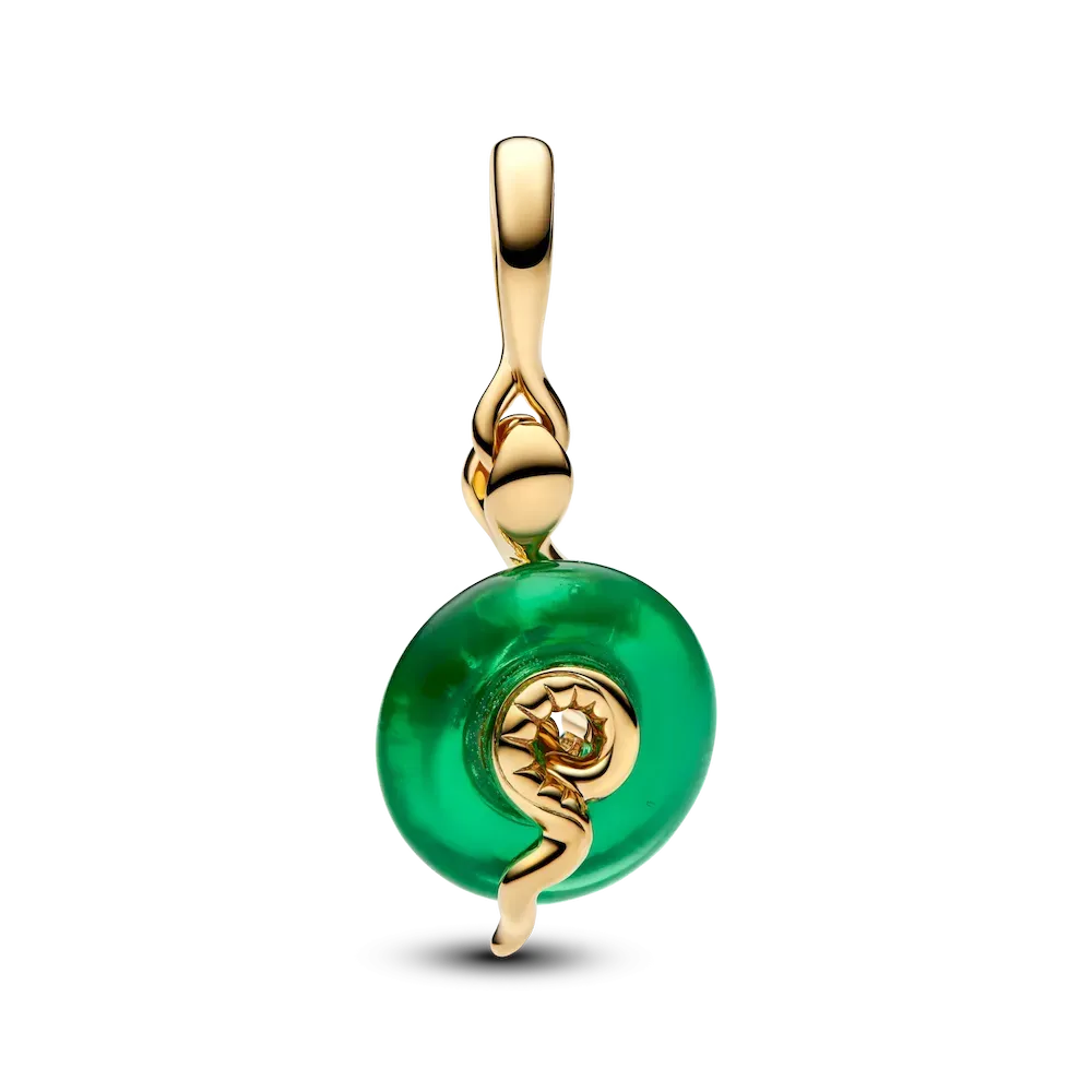 Embrace the spirit of the Lunar New Year with our Snake Green Murano Glass Dangle Charm. A 14k gold-plated patterned snake set with sparkling stones rests itself on top of a circle of deep green Murano glass. Symbolizing intelligence and transformation, this piece is the perfect way to welcome the Year of the Snake.