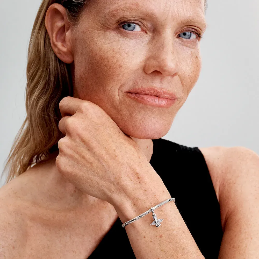 Carry the joy and wonder of the season with our Sparkling Angel Dangle Charm. A sterling silver angel with sparkling stone-set wings carries a sparkling star, shining its festive light for the holidays and beyond. Carry it as a reminder that you shine bright everywhere you go or gift it to whoever needs a little extra holiday joy in your life.