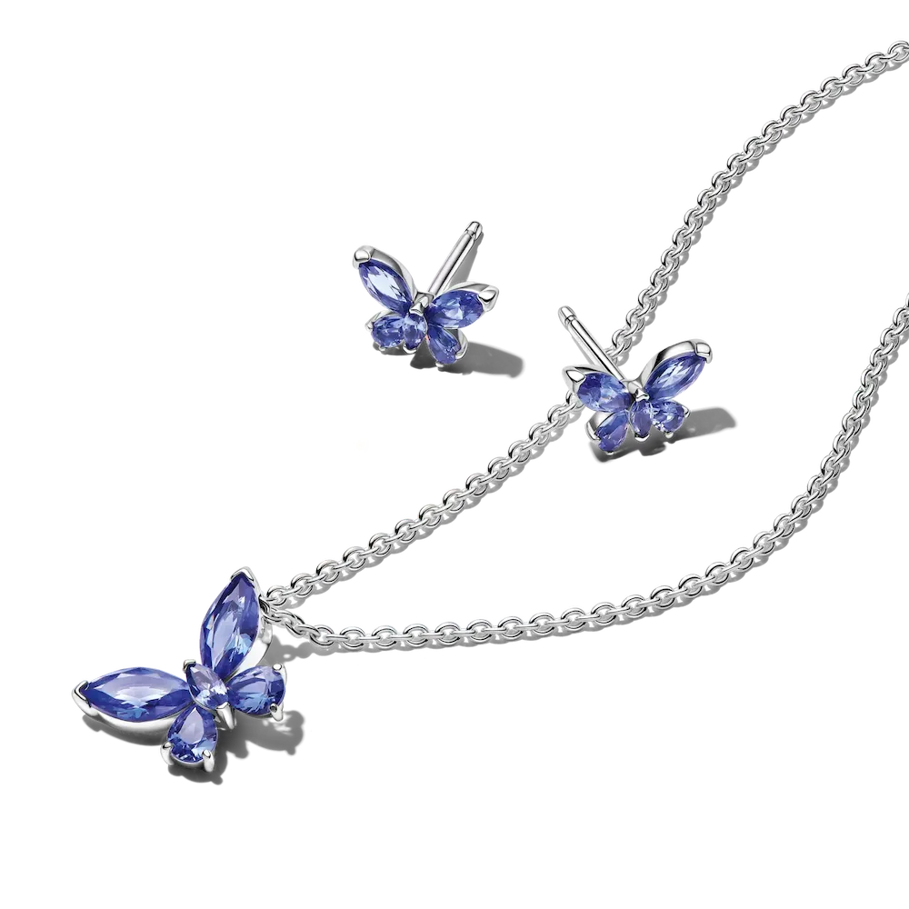 Celebrate transformation with this sterling silver jewelry set featuring butterfly studs and a pendant necklace with shimmering blue man-made crystals. A graceful gift for someone who’s always evolving.