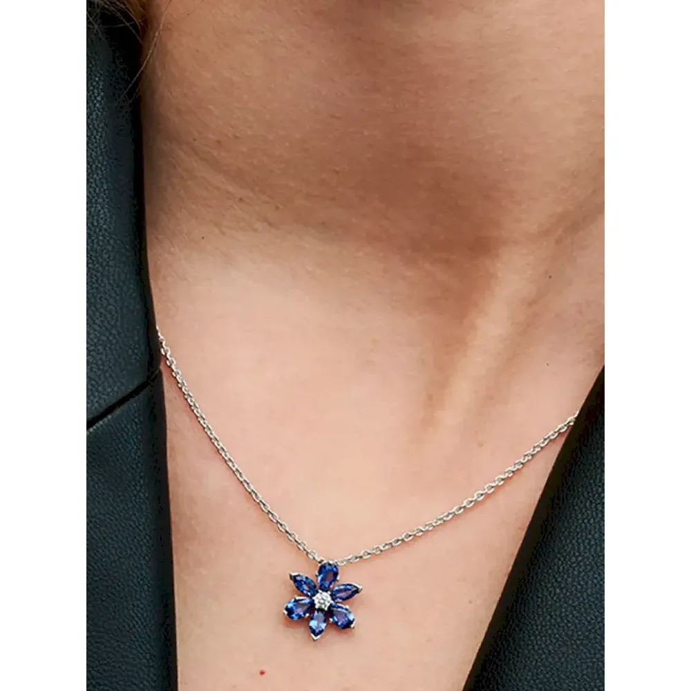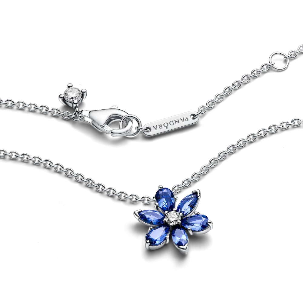 Choose nature-inspired shine with the Sparkling Blue Herbarium Cluster Pendant Necklace. Featuring beautiful blue man-made crystals in the shape of a flower, this sterling silver necklace is inspired by collections of pressed flowers. Featuring marquise, pear and round-cut cubic zirconia, this flower-shaped necklace adds elevated sparkle to every style. Layer and combine different metals (or different coloured stones) together for a look that echoes the vibrant beauty of nature.
