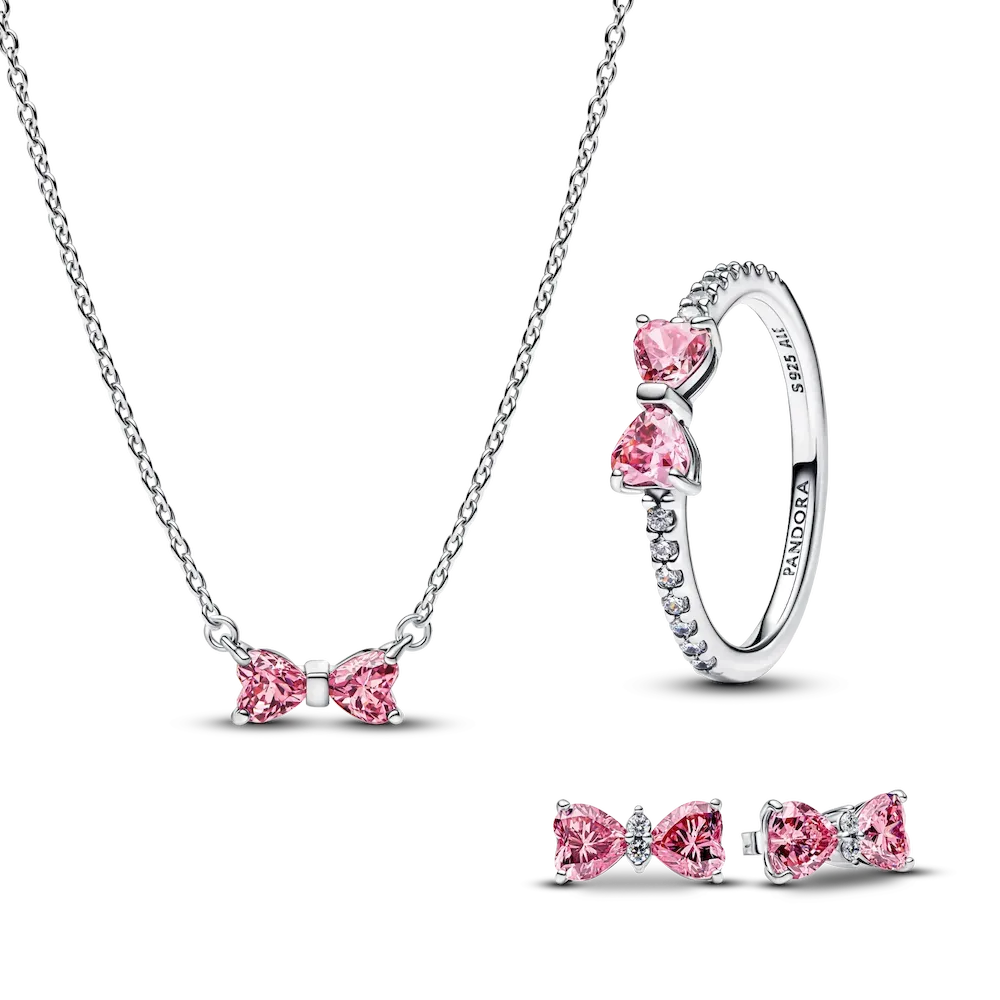Tie your look together with a bow. Or several. This set includes a matching bracelet, ring, and necklace – each crafted from sterling silver and detailed with a sparkling pink bow.