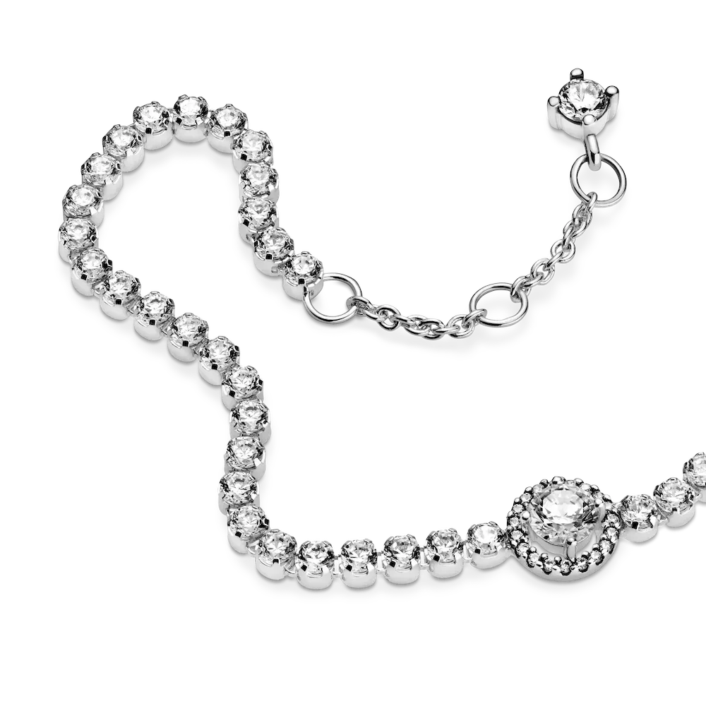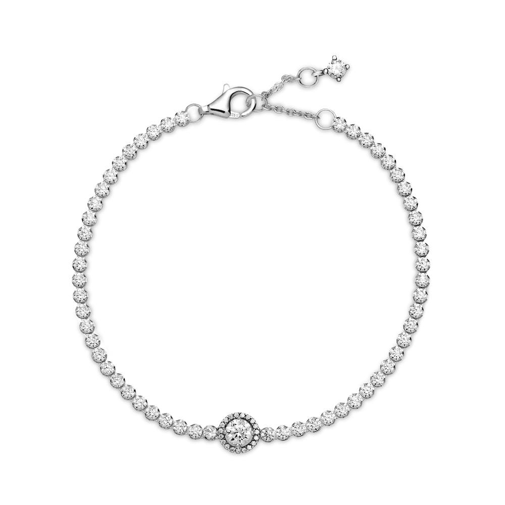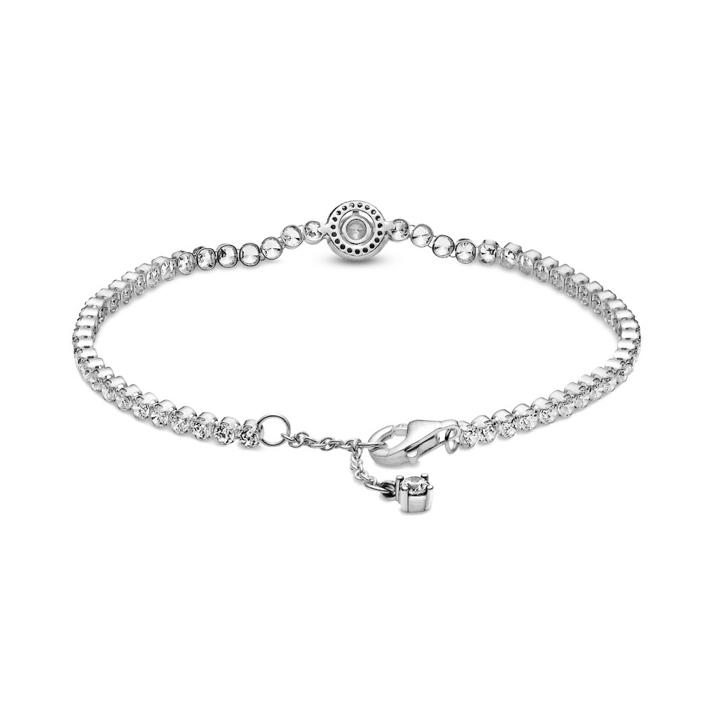 Level up your outfit with the Sparkling Halo Tennis Bracelet. Hand-finished in sterling silver, this shimmering piece is decorated with sparkling stones. The centrepiece features a big central stone surrounded by a halo of clear cubic zirconia. There’s a small stone detail at the end of the chain for added sparkle. This tennis bracelet includes a lobster clasp for safe closure. Style with other shimmering Pandora Timeless pieces for a classic look that stands out.