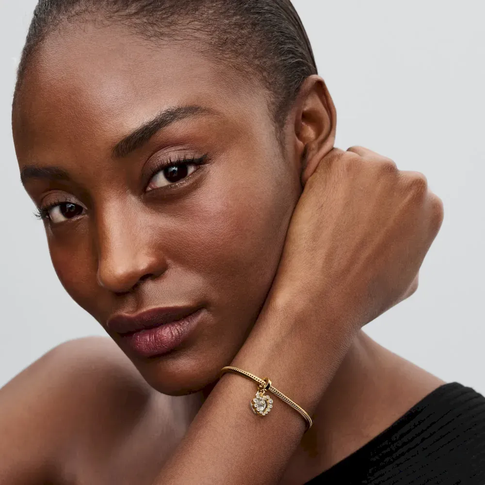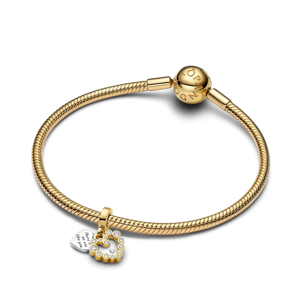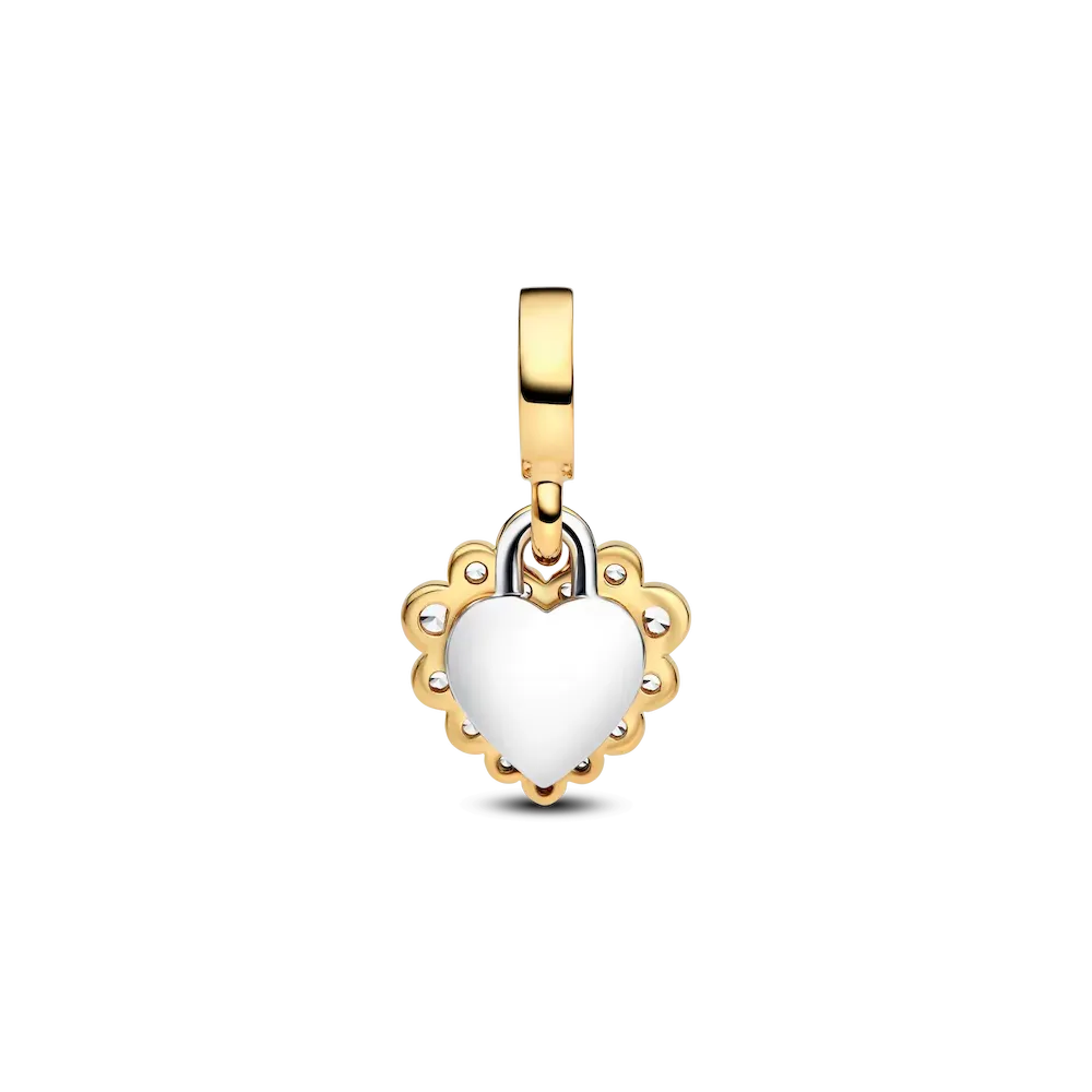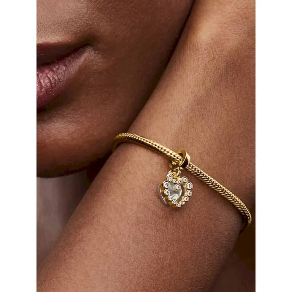 Make your feelings known with the Sparkling Heart Double Dangle Charm. Featuring sterling silver and 14k gold plating, this two-toned charm has two separate heart-shaped dangles. Sparkling stones form a border around the front dangle, with a floating stone at centre set in transparent resin. The back dangle reads