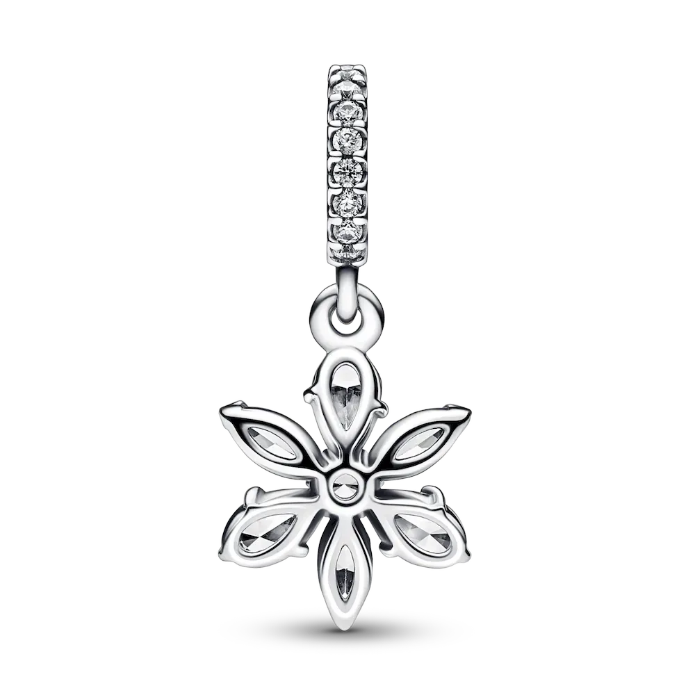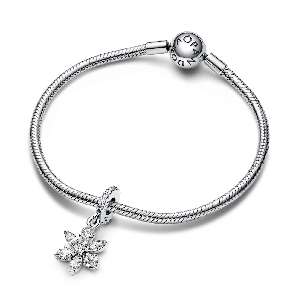 Bring the beauty of nature to your jewelry with the Sparkling Herbarium Cluster Dangle Charm. This sterling silver dangle charm features a cluster of alternating pear and marquise-shaped stones around a round center stone, forming a geometric shape inspired by petal and leaf elements. An elegant reinterpretation of the shapes we find in nature, perfect to bring a delicate, floating feel to your bracelet, necklace or earrings.