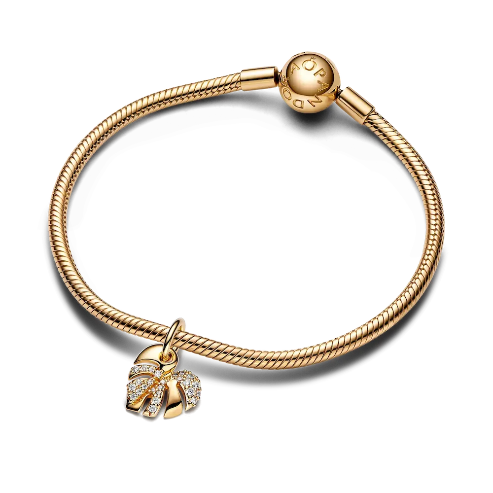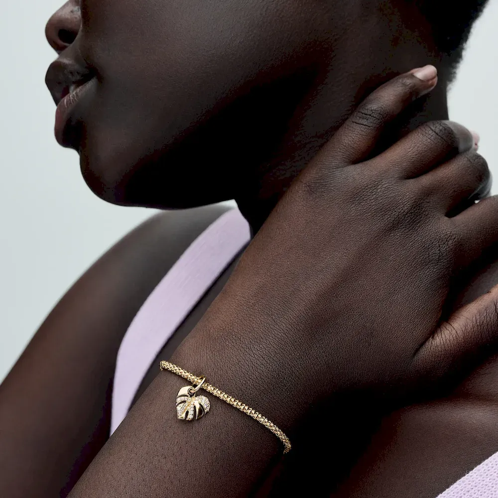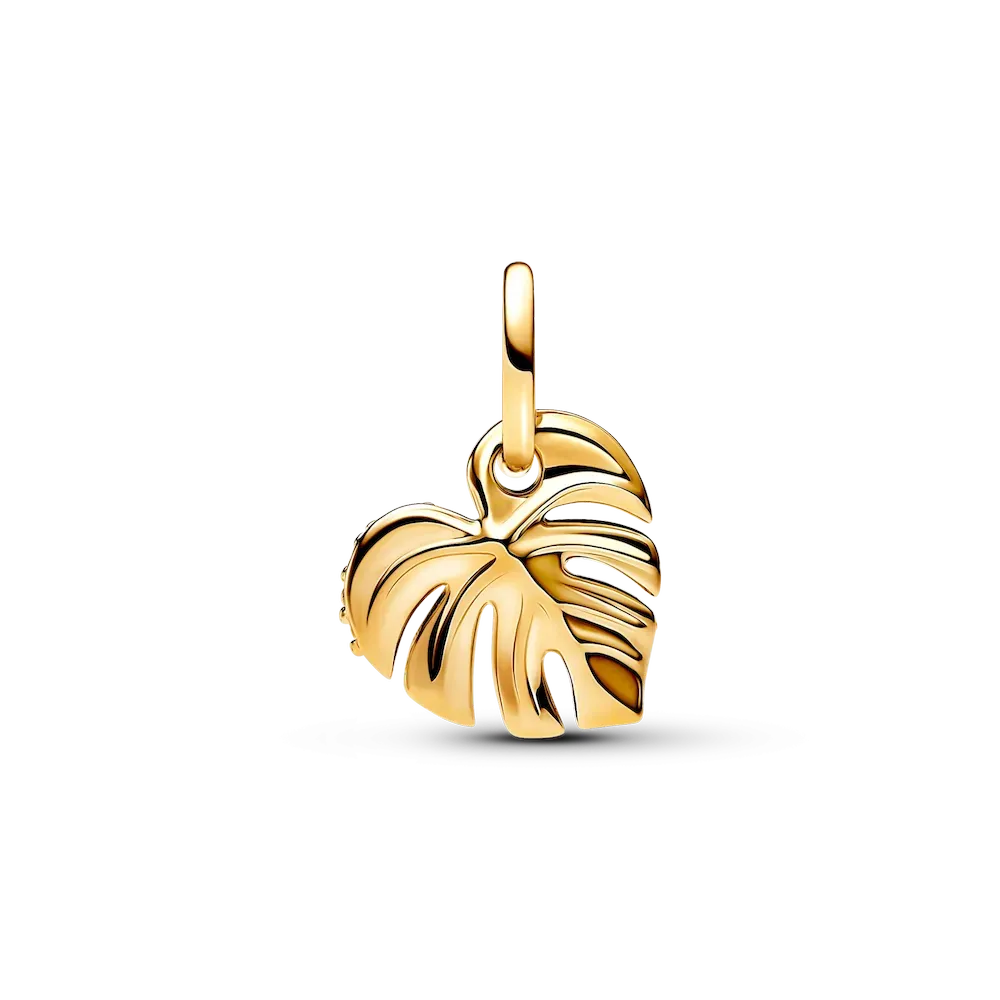 Wear an ode to nature with the Sparkling Monstera Leaf Dangle Charm. This 14k gold-plated leaf charm features one side covered in sparkling pavé, while the other side has realistic embellishments such as the ribs and veins found on real monstera leaves. The slitted details add to the charm’s delicate and realistic look. For plant lovers who feel most at home among greenery, this golden-toned charm is a perfect gift or accessory.