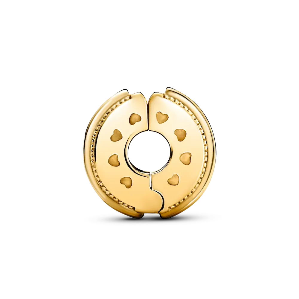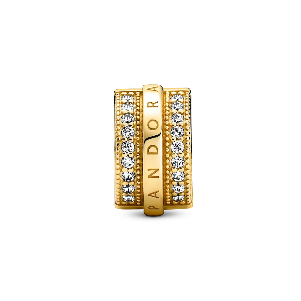 Give your look a stylish glow-up with the Sparkling PavĂ© Lines & Logo Clip Charm. Hand-finished in 14k gold plating, this charm features two sparkling rows of clear cubic zirconia pavĂ© framed by micro-beading with a raised centre row featuring the Pandora logo. The charm’s sides are embossed with hearts and its edges are squared. This warm-toned charm will elevate any outfit with modern sophistication and signature sparkle.