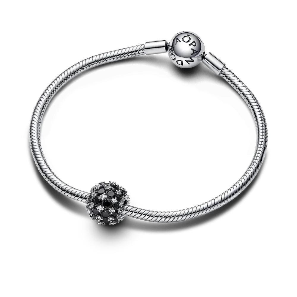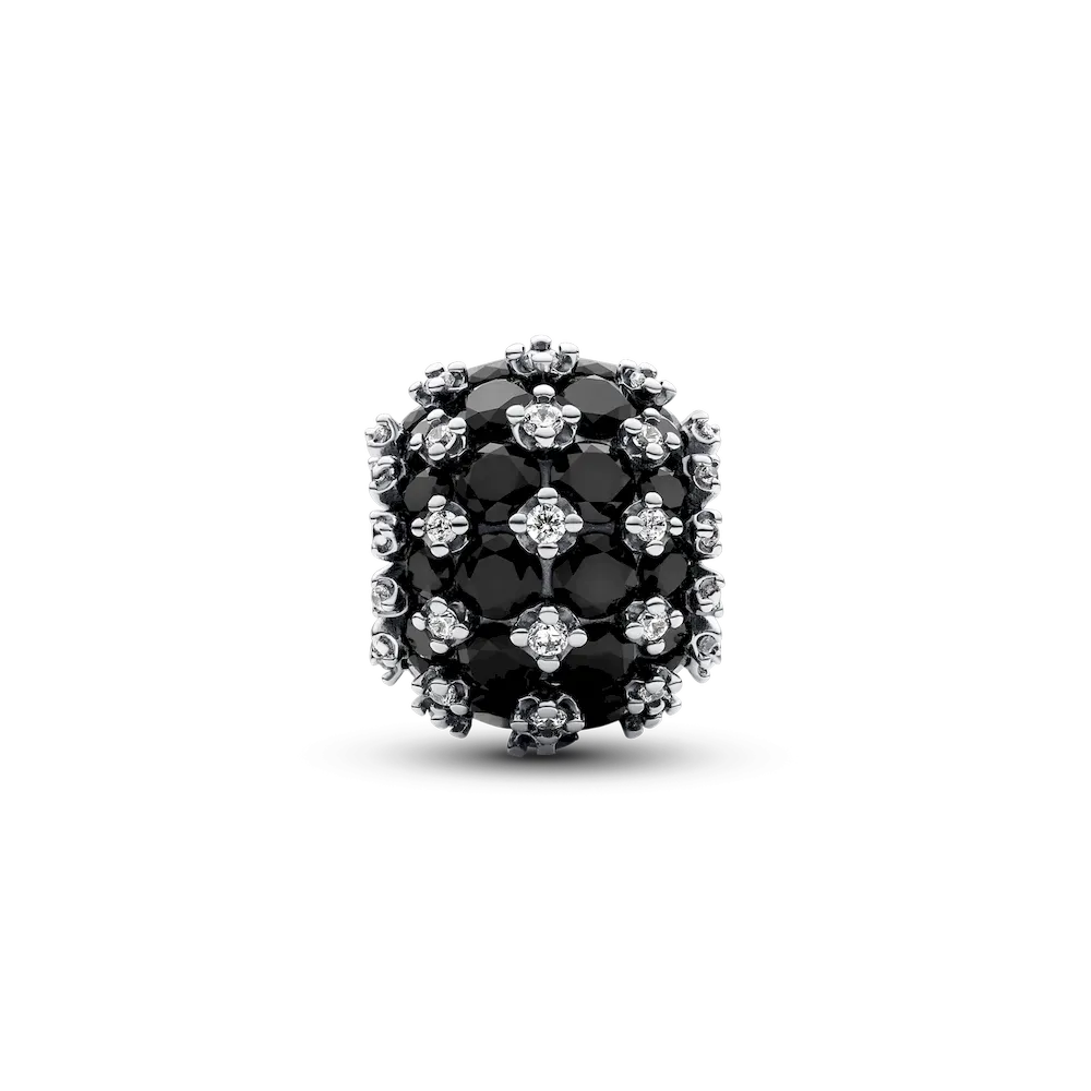 Add a touch of timeless sparkle to your look with the elegant and symbolic Sparkling Pavé Round Black Charm. This spherical sterling silver charm is set with a total of 88 clear and black cubic zirconia stones in different sizes, creating a voluminous geometric effect. 88 is a powerful number that represents progress, success and good fortune. It also resembles a double infinity symbol, representing the unlimited possibilities the future holds. Add it to your favorite jewelry styling or gift it to a loved one as a symbol of good things ahead.
