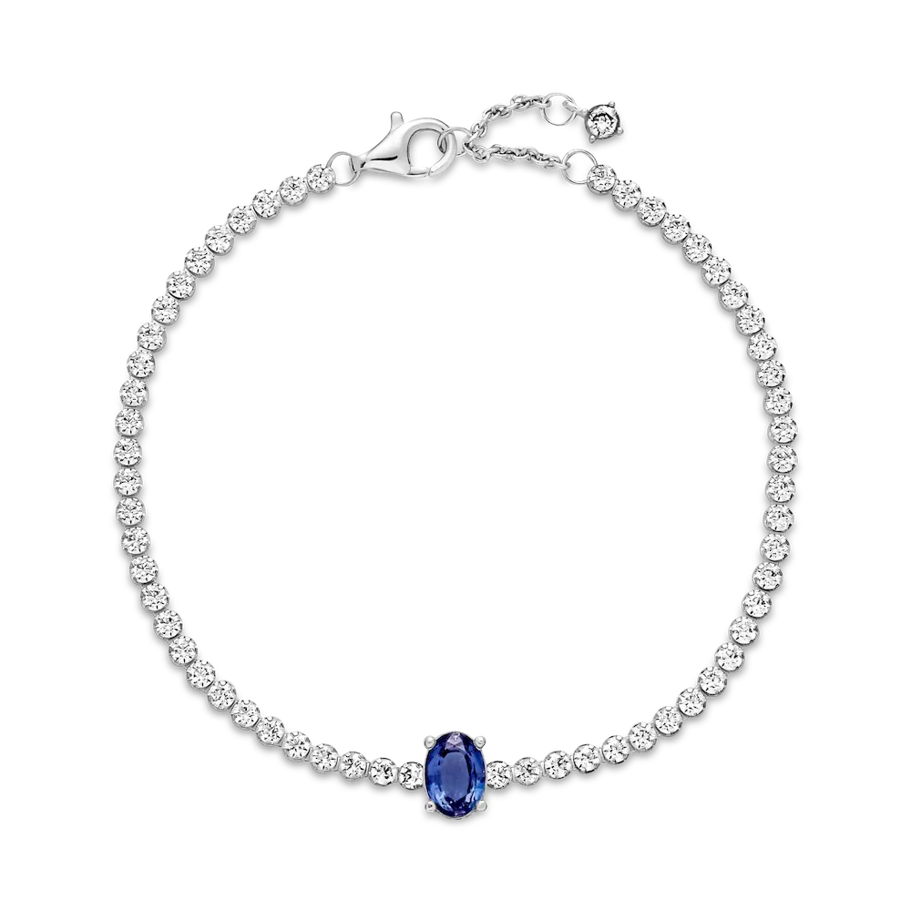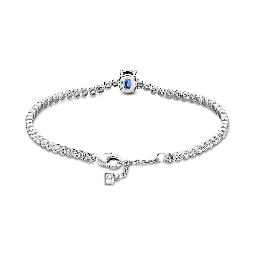 Bring elegance to your outfit with the Sparkling Pavé Tennis Bracelet. Hand-finished in sterling silver, this tennis bracelet features a large central prong-set oval princess blue crystal framed by a row of clear cubic zirconia pavé. The bracelet includes a lobster clasp for safe closure and can be adjusted to three lengths. Style this design on its own or with other shimmering Pandora Timeless pieces for a classic look that stands out.