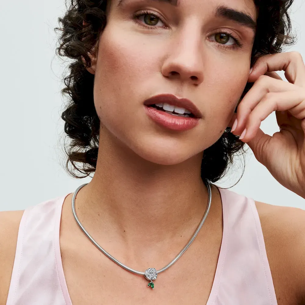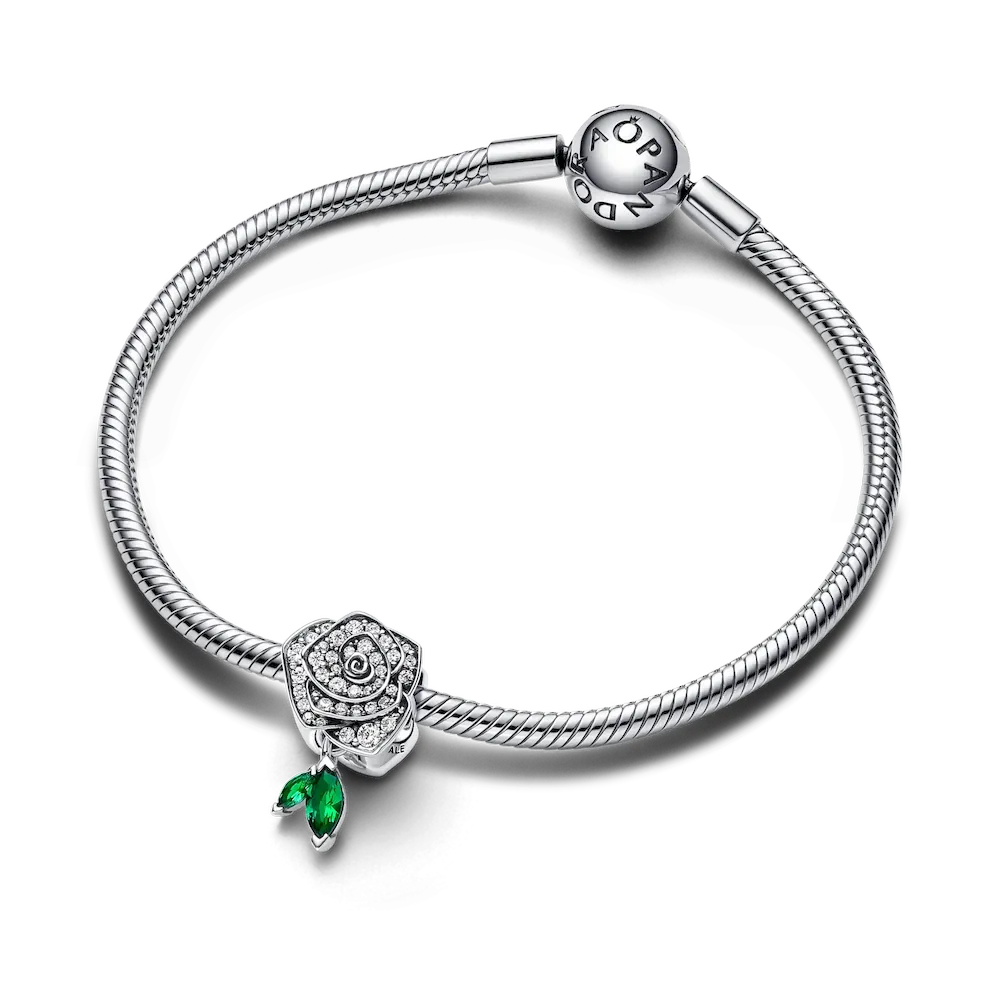 Embody floral elegance of our Sparkling Rose in Bloom Charm, a symbolic piece crafted in sterling silver. Intricately designed to capture the delicate nature of the flower, the charm features a layered petal effect to reflect the beauty of a rose in bloom and is covered with sparkling pavé. To lend an air of life-like details and movement, two green stones dangle beneath the flower representing leaves. Perfect as a gesture of love for someone close or as a meaningful addition to your collection, this Pandora rose charm is sure to keep the romance alive.