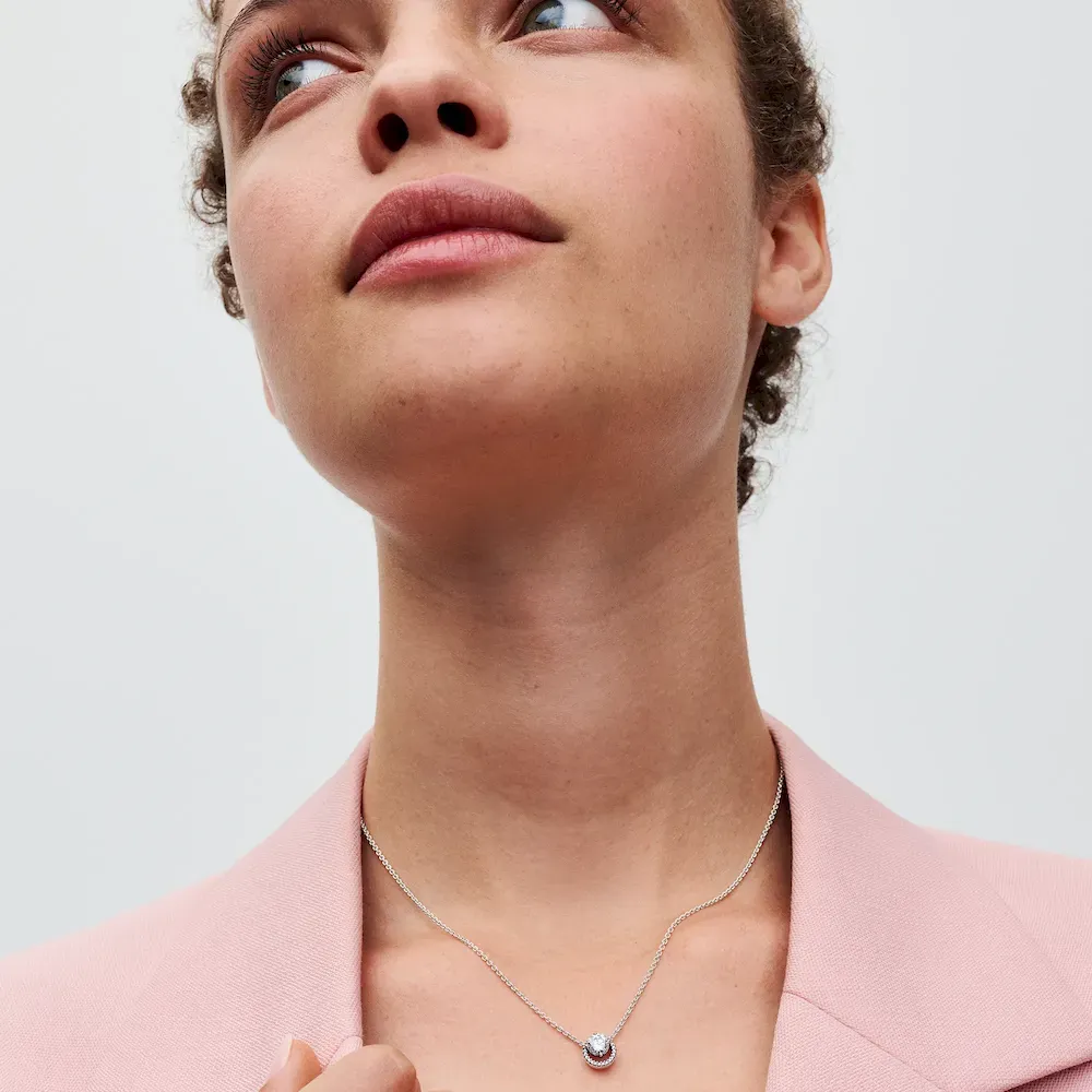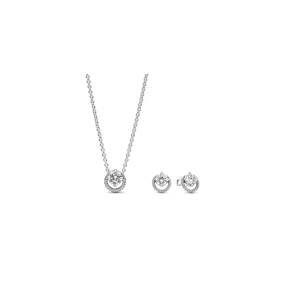 Bring on the shine with our Sparkling Round Halo Gift Set. Crafted from sterling silver, the stud earrings feature an off-centre round brilliant-cut cubic zirconia surrounded by an eye-catching pavé halo. With 30 sparkling cubic zirconia, these earrings capture the everlasting symbolism of circles. The sterling silver Sparkling Round Halo Pendant Collier Necklace, adorned with clear cubic zirconia, represents the enduring beauty of circles. The pendant features an off-centre, prong-set round stone that delicately overlaps a pavé halo, allowing it to slide freely along the adjustable 38 cm, 42 cm, or 45 cm cable chain. With an engraved Pandora logo and a dangling stone by the lobster clasp, this necklace adds sophistication to any look. The design, inspired by Pandora Timeless motifs, seamlessly blends classic beauty with giftable elegance.