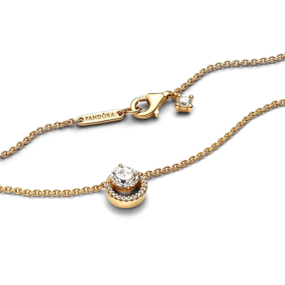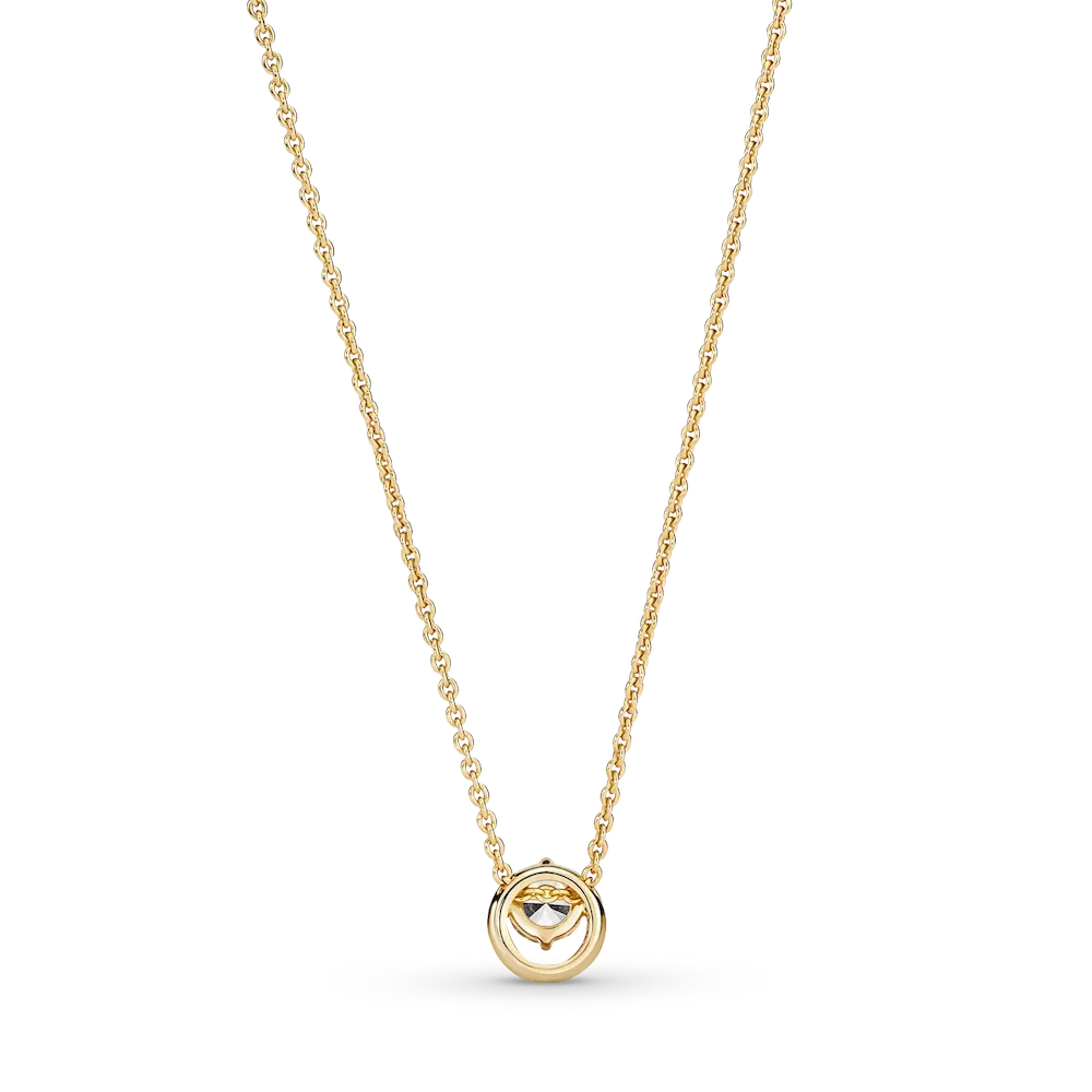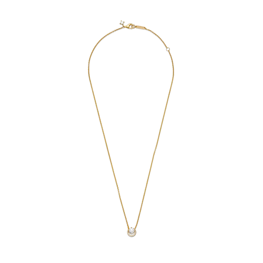 Classic meets contemporary in the 14k gold-plated Sparkling Round Halo Pendant Collier Necklace. The traditional halo setting has been given a fresh update with an off-centered stone setting to create a unique silhouette. The chain length is adjustable, making this a versatile finishing touch to your outfit.