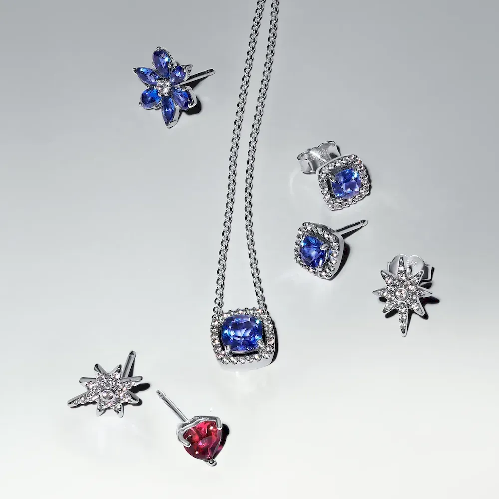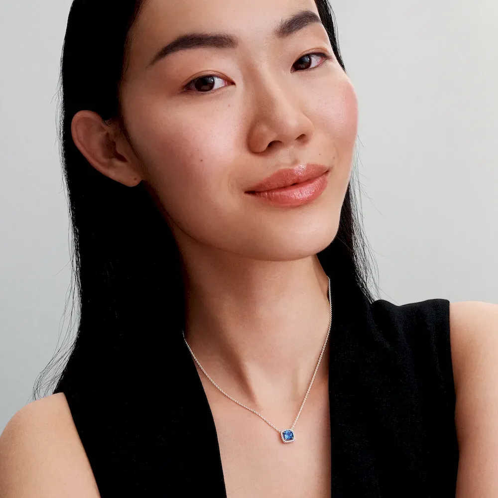 Add deep blue to your look with this statement necklace crafted from sterling silver. Featuring a blue crystal encircled by a squared halo of pavé cubic zirconia, this piece effortlessly blends modern and classic design. The pendant is fixed to the cable chain, which is adjustable up to three different lengths and features an additional prong-set brilliant-cut stone by the clasp.