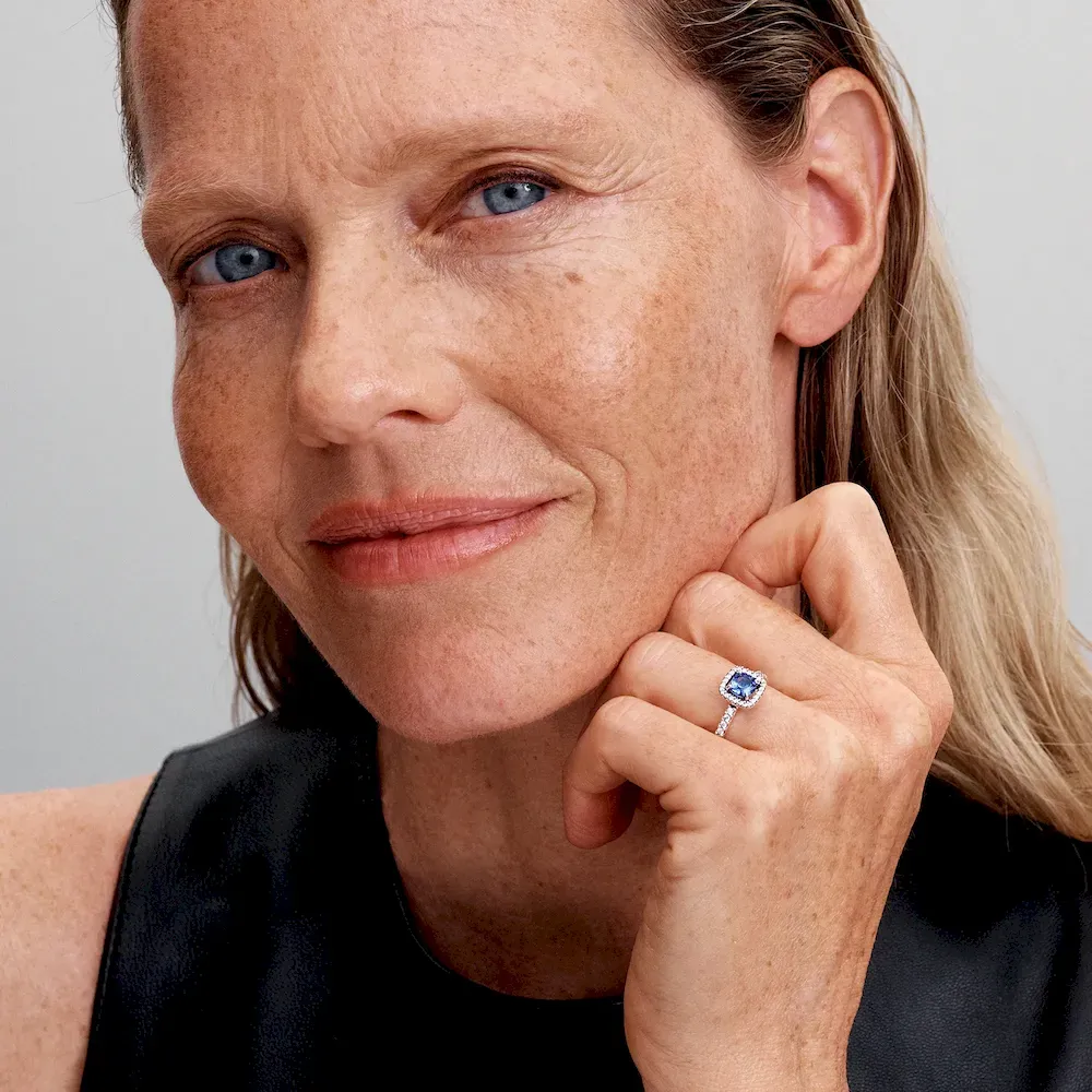 The Sparkling Square Blue Halo Ring combines modern elegance with an edge. Set in sterling silver, this ring features a cushion-cut blue man-made crystal, encircled by a squared halo of pavé. With additional pavé detailing on the band, this piece adds just the right amount of sparkle. Easy to stack with other rings, it’s a perfect addition to any existing collection. Embrace a lighter, brighter twist filled with light.